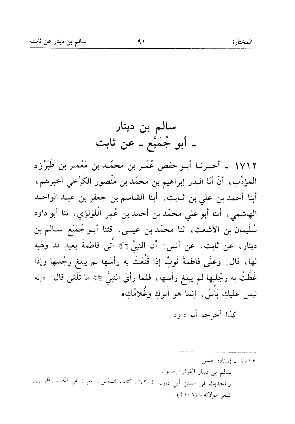 ١٧١٢ - أَخْبَرَنَا أَبُو حَفْصٍ عُمَرُ بْنُ مُحَمَّدِ بْنِ مَعْمَرِ بْنِ طَبَرْزَدَ الْمُؤَدِّبُ، أَنَّ أَبَا الْبَدْرِ إِبْرَاهِيمَ بْنَ مُحَمَّدِ بْنِ مَنْصُورٍ الْكَرْخِيَّ أَخْبَرَهُمْ، أَبْنَا أَحْمَدُ بْنُ عَلِيِّ بْنِ ثَابِتٍ، أَبْنَا الْقَاسِمُ بْنُ جَعْفَرِ بْنِ عَبْدِ الْوَاحِدِ الْهَاشِمِيُّ، أَبْنَا أَبُو عَلِيٍّ مُحَمَّدُ بْنُ أَحْمَدَ بْنِ عُمَرَ اللُّؤْلُؤِيُّ، ثَنَا أَبُو دَاوُدَ سُلَيْمَانُ بْنُ الْأَشْعَثِ، ثَنَا مُحَمَّدُ بْنُ عِيسَى، قَثَنَا أَبُو جُمَيْعٍ سَالِمُ بْنُ دِينَارٍ، عَنْ ثَابِتٍ، عَنْ أَنَسٍ أَنَّ النَّبِيَّ - صَلَّى اللهُ عَلَيْهِ وَسَلَّمَ - «أَتَى فَاطِمَةَ بِعَبْدٍ قَدْ وَهَبَهُ لَهَا، قَالَ: وَعَلَى فَاطِمَةَ ثَوْبٌ إِذَا قَنَّعَتْ بِهِ رَأْسَهَا لَمْ يَبْلُغْ رِجْلَيْهَا، وَإِذَا غَطَّتْ بِهِ رِجْلَيْهَا لَمْ يَبْلُغْ رَأْسَهَا، فَلَمَّا رَأَى النَّبِيُّ - صَلَّى اللهُ عَلَيْهِ وَسَلَّمَ - مَا تَلْقَى، قَالَ: إِنَّهُ لَيْسَ عَلَيْكِ بَأْسٌ، إِنَّمَا هُوَ أَبُوكِ وَغُلَامُكِ».