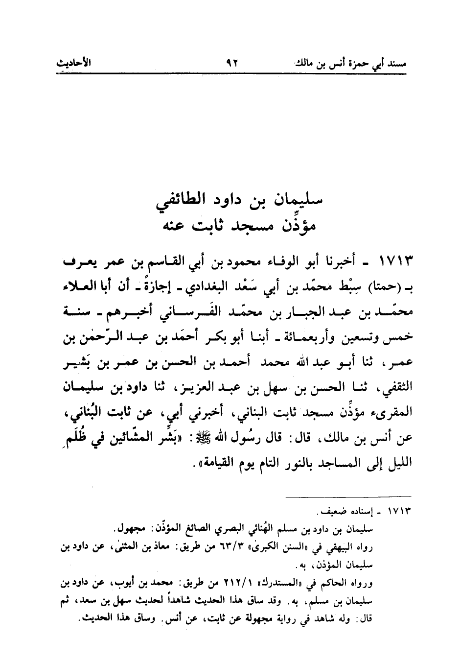١٧١٣ - أَخْبَرَنَا أَبُو الْوَفَاءِ مَحْمُودُ بْنُ أَبِي الْقَاسِمِ بْنِ عُمَرَ يُعْرَفُ بِـ (حَمَتَا) سِبْطُ مُحَمَّدِ بْنِ أَبِي سَعْدٍ الْبَغْدَادِيِّ - إِجَازَةً - أَنَّ أَبَا الْعَلَاءِ مُحَمَّدَ بْنَ عَبْدِ الْجَبَّارِ بْنِ مُحَمَّدٍ الْفِرْسَانِيَّ أَخْبَرَهُمْ - سَنَةَ خَمْسٍ وَتِسْعِينَ وَأَرْبَعِمِائَةٍ - أَبْنَا أَبُو بَكْرٍ أَحْمَدُ بْنُ عَبْدِ الرَّحْمَنِ بْنِ عُمَرَ، ثَنَا أَبُو عَبْدِ اللهِ مُحَمَّدُ بْنُ أَحْمَدَ بْنِ الْحَسَنِ بْنِ عُمَرَ بْنِ بَشِيرٍ الثَّقَفِيُّ، ثَنَا الْحَسَنُ بْنُ سَهْلِ بْنِ عَبْدِ الْعَزِيزِ، ثَنَا دَاوُدُ بْنُ سُلَيْمَانَ الْمُقْرِئُ مُؤَذِّنُ مَسْجِدِ ثَابِتٍ الْبُنَانِيِّ، أَخْبَرَنِي أَبِي، عَنْ ثَابِتٍ الْبُنَانِيِّ، عَنْ أَنَسِ بْنِ مَالِكٍ، قَالَ: قَالَ رَسُولُ اللهِ - صَلَّى اللهُ عَلَيْهِ وَسَلَّمَ -: «بَشِّرِ الْمَشَّائِينَ فِي ظُلَمِ اللَّيْلِ إِلَى الْمَسَاجِدِ بِالنُّورِ التَّامِّ يَوْمَ الْقِيَامَةِ».