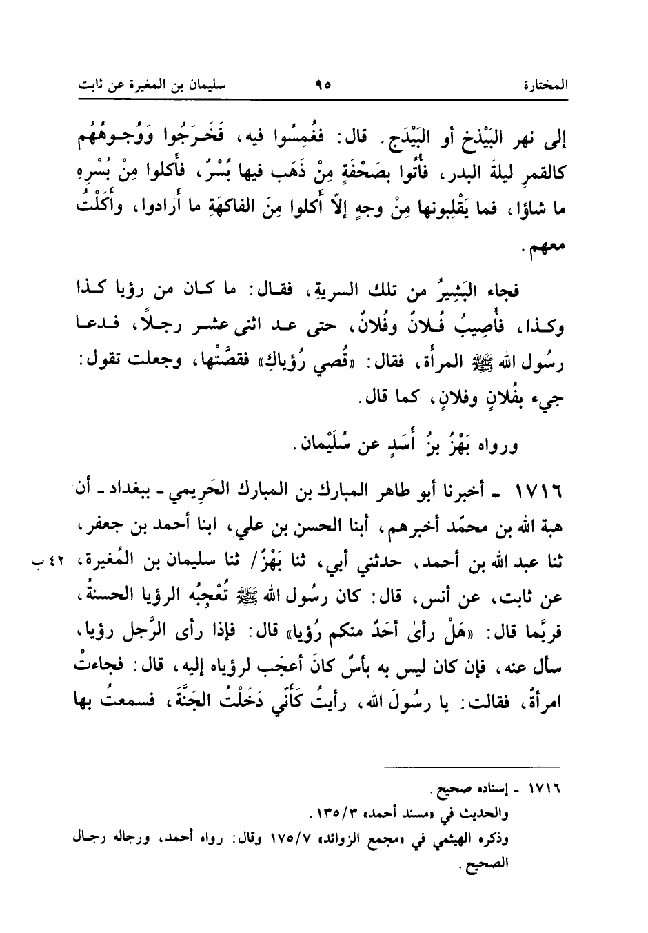 ١٧١٦ - أَخْبَرَنَا أَبُو طَاهِرٍ الْمُبَارَكُ بْنُ الْمُبَارَكِ الْحَرِيمِيُّ - بِبَغْدَادَ - أَنَّ هِبَةَ اللهِ بْنَ مُحَمَّدٍ أَخْبَرَهُمْ، أَبْنَا الْحَسَنُ بْنُ عَلِيٍّ، أَبْنَا أَحْمَدُ بْنُ جَعْفَرٍ، ثَنَا عَبْدُ اللهِ بْنُ أَحْمَدَ، حَدَّثَنِي أَبِي، ثَنَا بَهْزٌ، ثَنَا سُلَيْمَانُ بْنُ الْمُغِيرَةِ، عَنْ ثَابِتٍ، عَنْ أَنَسٍ، قَالَ: «كَانَ رَسُولُ اللهِ - صَلَّى اللهُ عَلَيْهِ وَسَلَّمَ - تُعْجِبُهُ الرُّؤْيَا الْحَسَنَةُ، فَرُبَّمَا قَالَ: هَلْ رَأَى أَحَدٌ مِنْكُمْ رُؤْيَا، قَالَ: فَإِذَا رَأَى الرَّجُلُ رُؤْيَا سَأَلَ عَنْهُ، فَإِنْ كَانَ لَيْسَ بِهِ بَأْسٌ كَانَ أَعْجَبَ لِرُؤْيَاهُ إِلَيْهِ، قَالَ: فَجَاءَتِ امْرَأَةٌ فَقَالَتْ: يَا رَسُولَ اللهِ رَأَيْتُ كَأَنِّي دَخَلْتُ الْجَنَّةَ فَسَمِعْتُ بِهَا