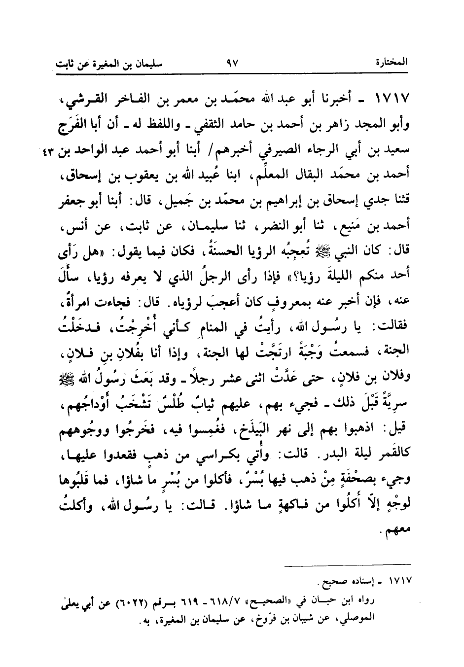 ١٧١٧ - أَخْبَرَنَا أَبُو عَبْدِ اللهِ مُحَمَّدُ بْنُ مَعْمَرِ بْنِ الْفَاخِرِ الْقُرَشِيُّ وَأَبُو الْمَجْدِ زَاهِرُ بْنُ أَحْمَدَ بْنِ حَامِدٍ الثَّقَفِيُّ - وَاللَّفْظُ لَهُ - أَنَّ أَبَا الْفَرَجِ سَعِيدَ بْنَ أَبِي الرَّجَاءِ الصَّيْرَفِيَّ أَخْبَرَهُمْ، أَبْنَا أَبُو أَحْمَدَ عَبْدُ الْوَاحِدِ بْنُ أَحْمَدَ بْنِ مُحَمَّدٍ الْبَقَّالُ الْمُعَلِّمُ، أَبْنَا عُبَيْدُ اللهِ بْنُ يَعْقُوبَ بْنِ إِسْحَاقَ، قَثَنَا جَدِّي إِسْحَاقُ بْنُ إِبْرَاهِيمَ بْنِ مُحَمَّدِ بْنِ جَمِيلٍ، قَالَ: أَبْنَا أَبُو جَعْفَرٍ أَحْمَدُ بْنُ مَنِيعٍ، ثَنَا أَبُو النَّضْرِ، ثَنَا سُلَيْمَانُ، عَنْ ثَابِتٍ، عَنْ أَنَسٍ، قَالَ: «كَانَ النَّبِيُّ - صَلَّى اللهُ عَلَيْهِ وَسَلَّمَ -: تُعْجِبُهُ الرُّؤْيَا الْحَسَنَةُ، فَكَانَ فِيمَا يَقُولُ: هَلْ رَأَى أَحَدٌ مِنْكُمُ اللَّيْلَةَ رُؤْيَا؟ فَإِذَا رَأَى الرَّجُلُ الَّذِي لَا يَعْرِفُهُ رُؤْيَا سَأَلَ عَنْهُ، فَإِنْ أُخْبِرَ عَنْهُ بِمَعْرُوفٍ كَانَ أَعْجَبَ لِرُؤْيَاهُ، قَالَ: فَجَاءَتِ امْرَأَةٌ، فَقَالَتْ: يَا رَسُولَ اللهِ رَأَيْتُ فِي الْمَنَامِ كَأَنِّي أُخْرِجْتُ فَدَخَلْتُ الْجَنَّةَ، فَسَمِعْتُ وَجْبَةً ارْتَجَّتْ لَهَا الْجَنَّةُ، وَإِذَا أَنَا بِفُلَانِ ابْنِ فُلَانٍ، وَفُلَانِ ابْنِ فُلَانٍ حَتَّى عَدَّتِ اثْنَيْ عَشَرَ رَجُلًا - وَقَدْ بَعَثَ رَسُولُ اللهِ - صَلَّى اللهُ عَلَيْهِ وَسَلَّمَ - سَرِيَّةً قَبْلَ ذَلِكَ - فَجِيءَ بِهِمْ عَلَيْهِمْ ثِيَابٌ طُلْسٌ تَشْخَبُ أَوْدَاجُهُمْ، قِيلَ: اذْهَبُوا بِهِمْ إِلَى نَهَرِ الْبَيْذَخِ، فَغُمِسُوا فِيهِ، فَخَرَجُوا وَوُجُوهُهُمْ كَالْقَمَرِ لَيْلَةَ الْبَدْرِ، قَالَتْ: وَأُتِي بِكَرَاسِيَّ مِنْ ذَهَبٍ فَقَعَدُوا عَلَيْهَا، وَجِيءَ بِصَحْفَةٍ مِنْ ذَهَبٍ فِيهَا بُسْرٌ، فَأَكَلُوا مِنْ بُسْرٍ مَا شَاءُوا، فَمَا قَلَبُوهَا لِوَجْهٍ إِلَّا أَكَلُوا مِنْ فَاكِهَةٍ مَا شَاءُوا، قَالَتْ: يَا رَسُولَ اللهِ وَأَكَلْتُ مَعَهُمْ.