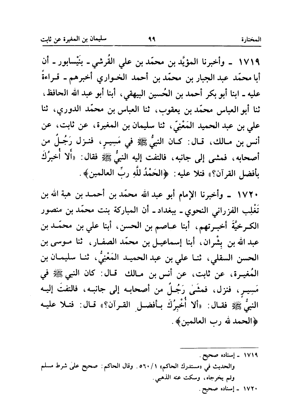 ١٧١٩ - وَأَخْبَرَنَا الْمُؤَيَّدُ بْنُ مُحَمَّدِ بْنِ عَلِيٍّ الطُّوسِيُّ (¬١) - بِنَيْسَابُورَ - أَنَّ أَبَا مُحَمَّدٍ عَبْدَ الْجَبَّارِ بْنَ مُحَمَّدِ بْنِ أَحْمَدَ الْخُوَارِيَّ أَخْبَرَهُمْ - قِرَاءَةً عَلَيْهِ - أَبْنَا أَبُو بَكْرٍ أَحْمَدُ بْنُ الْحُسَيْنِ الْبَيْهَقِيُّ، أَبْنَا أَبُو عَبْدِ اللهِ الْحَافِظُ، ثَنَا أَبُو الْعَبَّاسِ مُحَمَّدُ بْنُ يَعْقُوبَ، ثَنَا الْعَبَّاسُ بْنُ مُحَمَّدٍ الدُّورِيُّ، ثَنَا عَلِيُّ بْنُ عَبْدِ الْحَمِيدِ الْمَعْنِيُّ، ثَنَا سُلَيْمَانُ بْنُ الْمُغِيرَةِ، عَنْ ثَابِتٍ، عَنْ أَنَسِ بْنِ مَالِكٍ، قَالَ: «كَانَ النَّبِيُّ - صَلَّى اللهُ عَلَيْهِ وَسَلَّمَ - فِي مَسِيرٍ، فَنَزَلَ رَجُلٌ مِنْ أَصْحَابِهِ فَمَشَى إِلَى جَانِبِهِ فَالْتَفَتَ إِلَيْهِ النَّبِيُّ - صَلَّى اللهُ عَلَيْهِ وَسَلَّمَ - فَقَالَ: أَلَا أُخْبِرُكَ بِأَفْضَلِ الْقُرْآنِ؟ فَتَلَا عَلَيْهِ: {الْحَمْدُ لِلهِ رَبِّ الْعَالَمِينَ}».