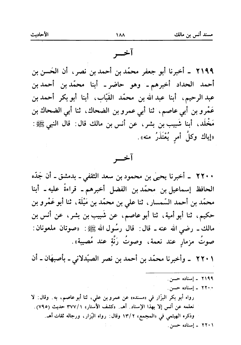 أَبَا عَلِيٍّ الْحَسَنَ بْنَ أَحْمَدَ الْحَدَّادَ أَخْبَرَهُمْ - وَهُوَ حَاضِرٌ - أَبْنَا أَبُو سَعِيدٍ الْحَسَنُ بْنُ مُحَمَّدِ بْنِ عَبْدِ اللهِ بْنِ حَسْنُوَيْهِ - إِجَازَةً - أَبْنَا عَبْدُ اللهِ بْنُ مُحَمَّدِ بْنِ عِيسَى الْخَشَّابُ، ثَنَا الْقَاضِي أَحْمَدُ بْنُ عَمْرِو بْنِ أَبِي عَاصِمٍ، ثَنَا أَبِي، ثَنَا أَبِي، ثَنَا شَبِيبٌ، ثَنَا أَنَسٌ قَالَ: قَالَ رَسُولُ اللهِ صَلَّى اللهُ عَلَيْهِ وَسَلَّمَ: «صَوْتَانِ مَلْعُونَانِ فِي الدُّنْيَا وَالْآخِرَةِ: صَوْتُ مِزْمَارٍ عِنْدَ النِّعْمَةِ، وَصَوْتُ اللَّعْنِ عِنْدَ الْمُصِيبَةِ»، يَعْنِي بِاللَّعْنِ: الْوَيْلَ لَهَا.