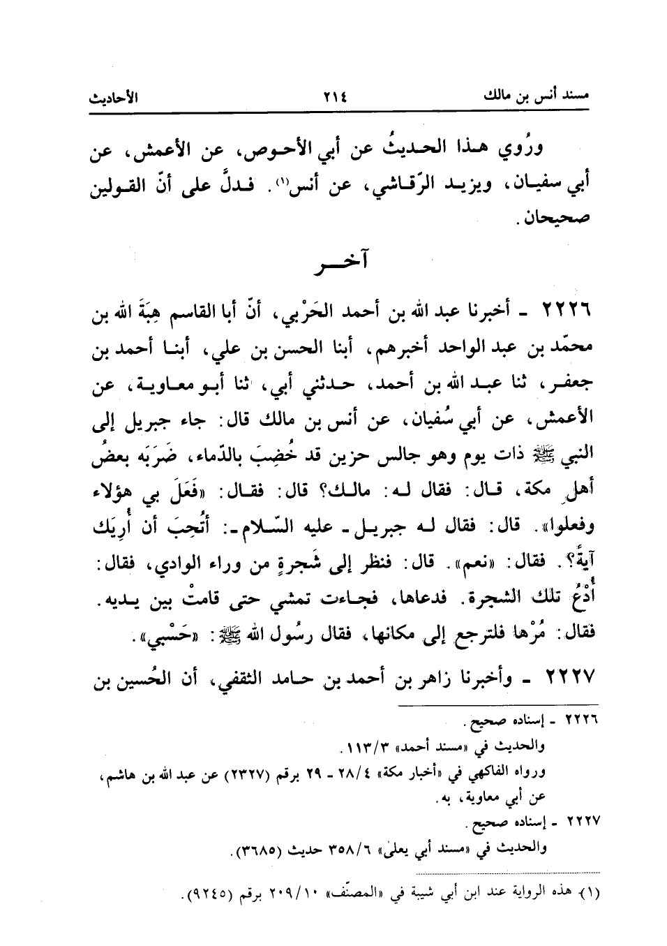 ٢٢٢٦ - أَخْبَرَنَا عَبْدُ اللهِ بْنُ أَحْمَدَ الْحَرْبِيُّ، أَنَّ أَبَا الْقَاسِمِ هِبَةَ اللهِ بْنَ مُحَمَّدِ بْنِ عَبْدِ الْوَاحِدِ أَخْبَرَهُمْ، أَبْنَا الْحَسَنُ بْنُ عَلِيٍّ، أَبْنَا أَحْمَدُ بْنُ جَعْفَرٍ، ثَنَا عَبْدُ اللهِ بْنُ أَحْمَدَ، حَدَّثَنِي أَبِي، ثَنَا أَبُو مُعَاوِيَةَ، عَنِ الْأَعْمَشِ، عَنْ أَبِي سُفْيَانَ، عَنْ أَنَسِ بْنِ مَالِكٍ قَالَ: «جَاءَ جِبْرِيلُ إِلَى النَّبِيِّ صَلَّى اللهُ عَلَيْهِ وَسَلَّمَ ذَاتَ يَوْمٍ وَهُوَ جَالِسٌ حَزِينٌ قَدْ خُضِبَ بِالدِّمَاءِ، ضَرَبَهُ بَعْضُ أَهْلِ مَكَّةَ، قَالَ: فَقَالَ لَهُ: مَا لَكَ؟ قَالَ: فَقَالَ: فَعَلَ بِي هَؤُلَاءِ وَفَعَلُوا، قَالَ: فَقَالَ لَهُ جِبْرِيلُ عَلَيْهِ السَّلَامُ: أَتُحِبُّ أَنْ أُرِيَكَ آيَةً؟ فَقَالَ: نَعَمْ، قَالَ: فَنَظَرَ إِلَى شَجَرَةٍ مِنْ وَرَاءِ الْوَادِي، فَقَالَ: ادْعُ تِلْكَ الشَّجَرَةَ، فَدَعَاهَا، فَجَاءَتْ تَمْشِي حَتَّى قَامَتْ بَيْنَ يَدَيْهِ، فَقَالَ: مُرْهَا فَلْتَرْجِعْ إِلَى مَكَانِهَا، فَقَالَ رَسُولُ اللهِ صَلَّى اللهُ عَلَيْهِ وَسَلَّمَ: حَسْبِي».