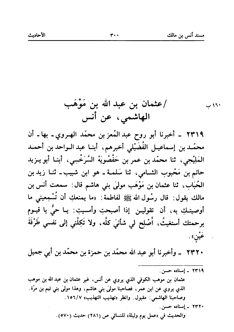 ٢٣١٩ - أَخْبَرَنَا أَبُو رَوْحٍ عَبْدُ الْمُعِزِّ بْنُ مُحَمَّدٍ الْهَرَوِيُّ - بِهَا - أَنَّ مُحَمَّدَ بْنَ إِسْمَاعِيلَ الْفُضَيْلِيَّ أَخْبَرَهُمْ، أَبْنَا عَبْدُ الْوَاحِدِ بْنُ أَحْمَدَ الْمَلِيحِيُّ، ثَنَا مُحَمَّدُ بْنُ عُمَرَ بْنِ حَفْصُوَيْهِ السَّرَخْسِيُّ، أَبْنَا أَبُو يَزِيدَ حَاتِمُ بْنُ مَحْبُوبٍ الشَّامِيُّ، ثَنَا سَلَمَةُ - هُوَ ابْنُ شَبِيبٍ - ثَنَا زَيْدُ بْنُ الْحُبَابِ، ثَنَا عُثْمَانُ بْنُ مَوْهَبٍ مَوْلَى بَنِي هَاشِمٍ قَالَ: سَمِعْتُ أَنَسَ بْنَ مَالِكٍ يَقُولُ: «قَالَ رَسُولُ اللهِ صَلَّى اللهُ عَلَيْهِ وَسَلَّمَ لِفَاطِمَةَ: مَا يَمْنَعُكِ أَنْ تُسْمِعِينِي مَا أَوْصَيْتُكِ بِهِ، أَنْ تَقُولِينَ إِذَا أَصْبَحْتِ وَأَمْسَيْتِ: يَا حَيُّ يَا قَيُّومُ بِرَحْمَتِكَ أَسْتَغِيثُ، أَصْلِحْ لِي شَأْنِي كُلَّهُ، وَلَا تَكِلْنِي إِلَى نَفْسِي طَرْفَةَ عَيْنٍ».