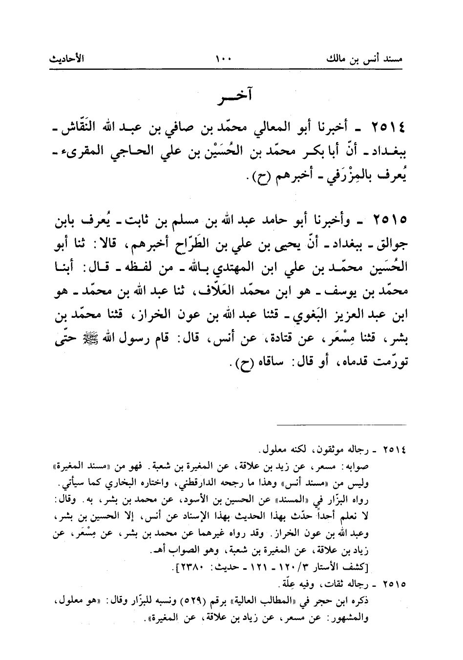 ٢٥١٥ - وَأَخْبَرَنَا أَبُو حَامِدٍ عَبْدُ اللهِ بْنُ مُسْلِمِ بْنِ ثَابِتٍ - يُعْرَفُ بِابْنِ جُوَالِقَ - بِبَغْدَادَ - أَنَّ يَحْيَى بْنَ عَلِيِّ بْنِ الطَّرَّاحِ أَخْبَرَهُمْ، قَالَا: ثَنَا أَبُو الْحُسَيْنِ مُحَمَّدُ بْنُ عَلِيِّ ابْنِ الْمُهْتَدِي بِاللهِ - مِنْ لَفْظِهِ - قَالَ: أَبْنَا مُحَمَّدُ بْنُ يُوسُفَ - هُوَ ابْنُ مُحَمَّدٍ الْعَلَّافُ - ثَنَا عَبْدُ اللهِ بْنُ مُحَمَّدٍ - هُوَ ابْنُ عَبْدِ الْعَزِيزِ الْبَغَوِيُّ - قَثَنَا عَبْدُ اللهِ بْنُ عَوْنٍ الْخَرَّازُ، قَثَنَا مُحَمَّدُ بْنُ بِشْرٍ، قَثَنَا مِسْعَرٌ، عَنْ قَتَادَةَ، عَنْ أَنَسٍ قَالَ: «قَامَ رَسُولُ اللهِ صَلَّى اللهُ عَلَيْهِ وَسَلَّمَ حَتَّى تَوَرَّمَتْ قَدَمَاهُ، أَوْ قَالَ: سَاقَاهُ» (ح).