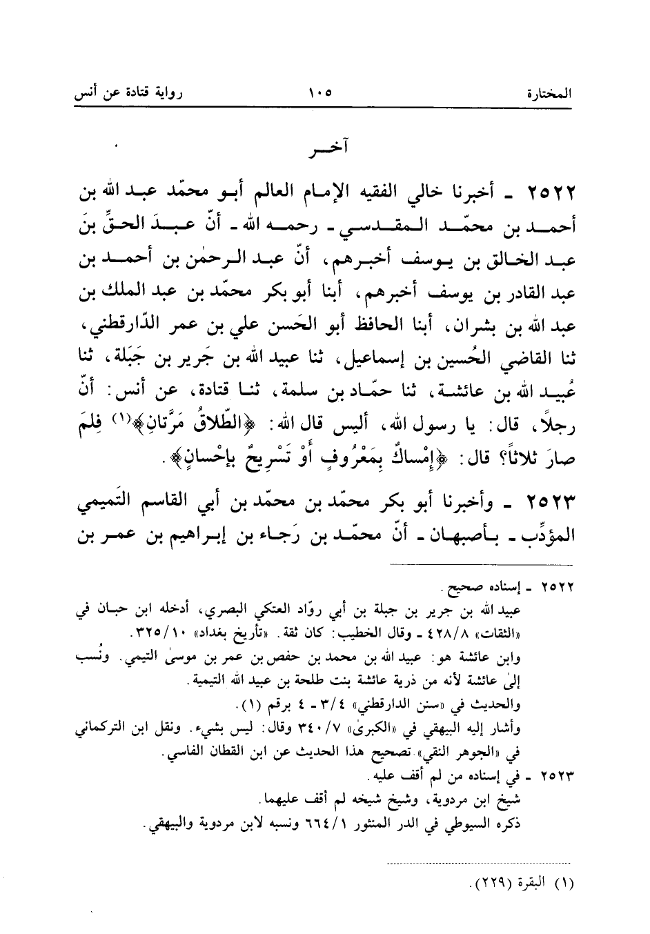 ٢٥٢٢ - أَخْبَرَنَا خَالِي الْفَقِيهُ الْإِمَامُ الْعَالِمُ أَبُو مُحَمَّدٍ عَبْدُ اللهِ بْنُ أَحْمَدَ بْنِ مُحَمَّدٍ الْمَقْدِسِيُّ - رَحِمَهُ اللهُ - أَنَّ عَبْدَ الْحَقِّ بْنَ عَبْدِ الْخَالِقِ بْنِ يُوسُفَ أَخْبَرَهُمْ، أَنَّ عَبْدَ الرَّحْمَنِ بْنَ أَحْمَدَ بْنِ عَبْدِ الْقَادِرِ بْنِ يُوسُفَ أَخْبَرَهُمْ، أَبْنَا أَبُو بَكْرٍ مُحَمَّدُ بْنُ عَبْدِ الْمَلِكِ بْنِ عَبْدِ اللهِ بْنِ بِشْرَانَ، أَبْنَا الْحَافِظُ أَبُو الْحَسَنِ عَلِيُّ بْنُ عُمَرَ الدَّارَقُطْنِيُّ، ثَنَا الْقَاضِي الْحُسَيْنُ بْنُ إِسْمَاعِيلَ، ثَنَا عُبَيْدُ اللهِ بْنُ جَرِيرِ بْنِ جَبَلَةَ، ثَنَا عُبَيْدُ اللهِ بْنُ عَائِشَةَ، ثَنَا حَمَّادُ بْنُ سَلَمَةَ، ثَنَا قَتَادَةُ، عَنْ أَنَسٍ: «أَنَّ رَجُلًا قَالَ: يَا رَسُولَ اللهِ، أَلَيْسَ قَالَ اللهُ: {الطَّلاقُ مَرَّتَانِ} فَلِمَ صَارَ ثَلَاثًا؟ قَالَ: {فَإِمْسَاكٌ بِمَعْرُوفٍ أَوْ تَسْرِيحٌ بِإِحْسَانٍ}».