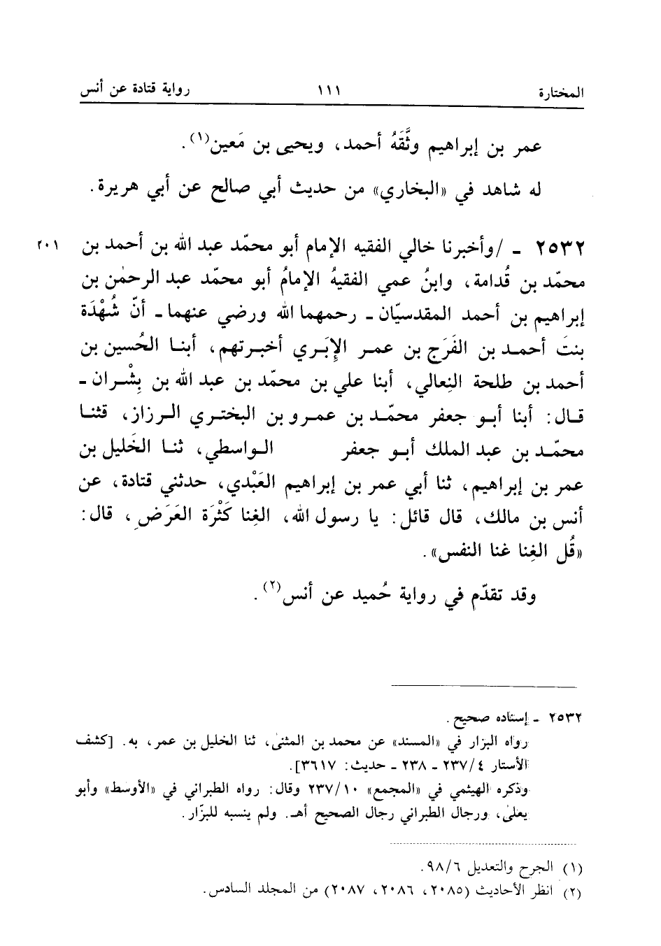 ٢٥٣٢ - وَأَخْبَرَنَا خَالِي الْفَقِيهُ الْإِمَامُ أَبُو مُحَمَّدٍ عَبْدُ اللهِ بْنُ أَحْمَدَ بْنِ مُحَمَّدِ بْنِ قُدَامَةَ، وَابْنُ عَمِّي الْفَقِيهُ الْإِمَامُ أَبُو مُحَمَّدٍ عَبْدُ الرَّحْمَنِ بْنُ إِبْرَاهِيمَ بْنِ أَحْمَدَ الْمَقْدِسِيَّانِ - رَحِمَهُمَا اللهُ وَرَضِيَ عَنْهُمَا - أَنَّ شُهْدَةَ بِنْتَ أَحْمَدَ بْنِ الْفَرَجِ بْنِ عُمَرَ الْإِبَرِيِّ أَخْبَرَتْهُمْ، أَبْنَا الْحُسَيْنُ بْنُ أَحْمَدَ بْنِ طَلْحَةَ النِّعَالِيُّ، أَبْنَا عَلِيُّ بْنُ مُحَمَّدِ بْنِ عَبْدِ اللهِ بْنِ بِشْرَانَ - قَالَ: أَبْنَا أَبُو جَعْفَرٍ مُحَمَّدُ بْنُ عَمْرِو بْنِ الْبَخْتَرِيِّ الرَّزَّازُ، قَثَنَا مُحَمَّدُ بْنُ عَبْدِ الْمَلِكِ أَبُو جَعْفَرٍ الْوَاسِطِيُّ، ثَنَا الْخَلِيلُ بْنُ عُمَرَ بْنِ إِبْرَاهِيمَ، ثَنَا أَبِي عُمَرُ بْنُ إِبْرَاهِيمَ الْعَبْدِيُّ، حَدَّثَنِي قَتَادَةُ، عَنْ أَنَسِ بْنِ مَالِكٍ، «قَالَ قَائِلٌ: يَا رَسُولَ اللهِ، الْغِنَى كَثْرَةُ الْعَرَضِ؟ قَالَ: قُلِ: الْغِنَى غِنَى النَّفْسِ».