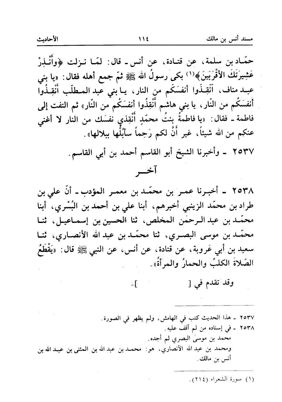 ٢٥٣٨ - أَخْبَرَنَا عُمَرُ بْنُ مُحَمَّدِ بْنِ مَعْمَرٍ الْمُؤَدِّبُ أَنَّ عَلِيَّ بْنَ طَرَّادِ بْنِ مُحَمَّدٍ الزَّيْنَبِيَّ أَخْبَرَهُمْ، أَبْنَا عَلِيُّ بْنُ أَحْمَدَ بْنِ الْبُسْرِيِّ، أَبْنَا مُحَمَّدُ بْنُ عَبْدِ الرَّحْمَنِ الْمُخَلِّصُ، ثَنَا الْحُسَيْنُ بْنُ إِسْمَاعِيلَ، ثَنَا مُحَمَّدُ بْنُ مُوسَى الْبَصْرِيُّ، ثَنَا مُحَمَّدُ بْنُ عَبْدِ اللهِ الْأَنْصَارِيُّ، ثَنَا سَعِيدُ بْنُ أَبِي عَرُوبَةَ، عَنْ قَتَادَةَ، عَنْ أَنَسٍ، عَنِ النَّبِيِّ صَلَّى اللهُ عَلَيْهِ وَسَلَّمَ قَالَ: «يَقْطَعُ الصَّلَاةَ الْكَلْبُ وَالْحِمَارُ وَالْمَرْأَةُ».