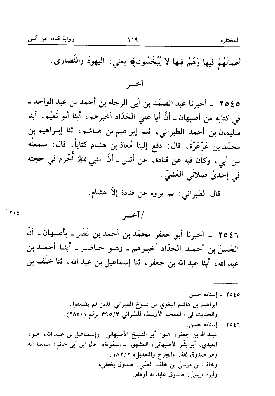 ٢٥٤٥ - أَخْبَرَنَا عَبْدُ الصَّمَدِ بْنُ أَبِي الرَّجَاءِ بْنِ أَحْمَدَ بْنِ عَبْدِ الْوَاحِدِ فِي كِتَابِهِ مِنْ أَصْبَهَانَ أَنَّ أَبَا عَلِيٍّ الْحَدَّادَ أَخْبَرَهُمْ، أَبْنَا أَبُو نُعَيْمٍ، أَبْنَا سُلَيْمَانُ بْنُ أَحْمَدَ الطَّبَرَانِيُّ، ثَنَا إِبْرَاهِيمُ بْنُ هَاشِمٍ، ثَنَا إِبْرَاهِيمُ بْنُ مُحَمَّدِ بْنِ عَرْعَرَةَ قَالَ: دَفَعَ إِلَيْنَا مُعَاذُ بْنُ هِشَامٍ كِتَابًا، قَالَ: سَمِعْتُهُ مِنْ أَبِي وَكَانَ فِيهِ عَنْ قَتَادَةَ، عَنْ أَنَسٍ: «أَنَّ النَّبِيَّ صَلَّى اللهُ عَلَيْهِ وَسَلَّمَ أَحْرَمَ فِي حَجَّتِهِ فِي إِحْدَى صَلَاتَيِ الْعَشِيِّ».
