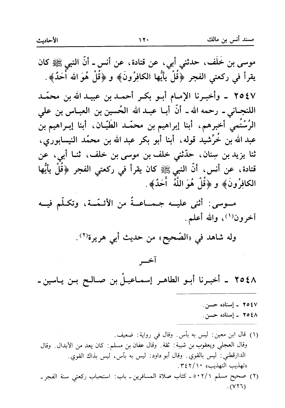 ٢٥٤٧ - وَأَخْبَرَنَا الْإِمَامُ أَبُو بَكْرٍ أَحْمَدُ بْنُ عُبَيْدِ اللهِ بْنِ مُحَمَّدٍ اللَّنْجَانِيُّ رَحِمَهُ اللهُ أَنَّ أَبَا عَبْدِ اللهِ الْحُسَيْنَ بْنَ الْعَبَّاسِ بْنِ عَلِيٍّ الرُّسْتُمِيَّ (¬١) أَخْبَرَهُمْ، أَبْنَا إِبْرَاهِيمُ بْنُ مُحَمَّدٍ الطَّيَّانُ، أَبْنَا إِبْرَاهِيمُ بْنُ عَبْدِ اللهِ بْنِ خُرْشَيْدَ قَوْلَهُ، أَبْنَا أَبُو بَكْرٍ عَبْدُ اللهِ بْنُ مُحَمَّدٍ النَّيْسَابُورِيُّ، ثَنَا يَزِيدُ بْنُ سِنَانٍ، حَدَّثَنِي خَلَفُ بْنُ مُوسَى بْنِ خَلَفٍ، ثَنَا أَبِي، عَنْ قَتَادَةَ، عَنْ أَنَسٍ: أَنَّ النَّبِيَّ صَلَّى اللهُ عَلَيْهِ وَسَلَّمَ «كَانَ يَقْرَأُ فِي رَكْعَتَيِ الْفَجْرِ: {قُلْ يَا أَيُّهَا الْكَافِرُونَ} وَ {قُلْ هُوَ اللهُ أَحَدٌ}».