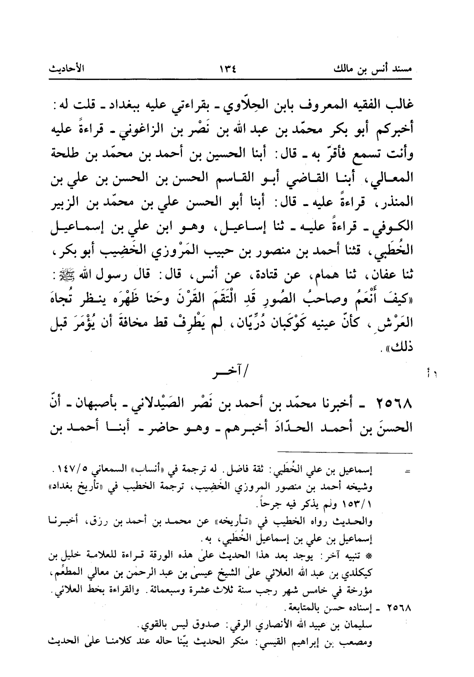 ٢٥٦٨ - أَخْبَرَنَا مُحَمَّدُ بْنُ أَحْمَدَ بْنِ نَصْرٍ الصَّيْدَلَانِيُّ - بِأَصْبَهَانَ - أَنَّ الْحَسَنَ بْنَ أَحْمَدَ الْحَدَّادَ أَخْبَرَهُمْ - وَهُوَ حَاضِرٌ - أَبْنَا أَحْمَدُ بْنُ