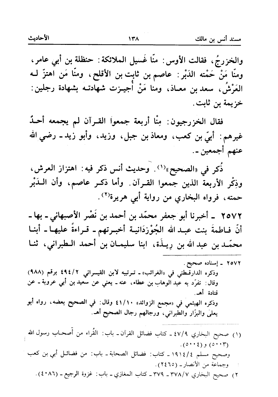 وَقَالَ الْخَزْرَجُ: مِنَّا أَرْبَعَةٌ جَمَعُوا الْقُرْآنَ عَلَى عَهْدِ رَسُولِ اللهِ صَلَّى اللهُ عَلَيْهِ وَسَلَّمَ لَمْ يَجْمَعْهُ غَيْرُهُمْ: أُبَيُّ بْنُ كَعْبٍ، وَمُعَاذُ بْنُ جَبَلٍ، وَزَيْدُ بْنُ ثَابِتٍ، وَأَبُو زَيْدٍ».