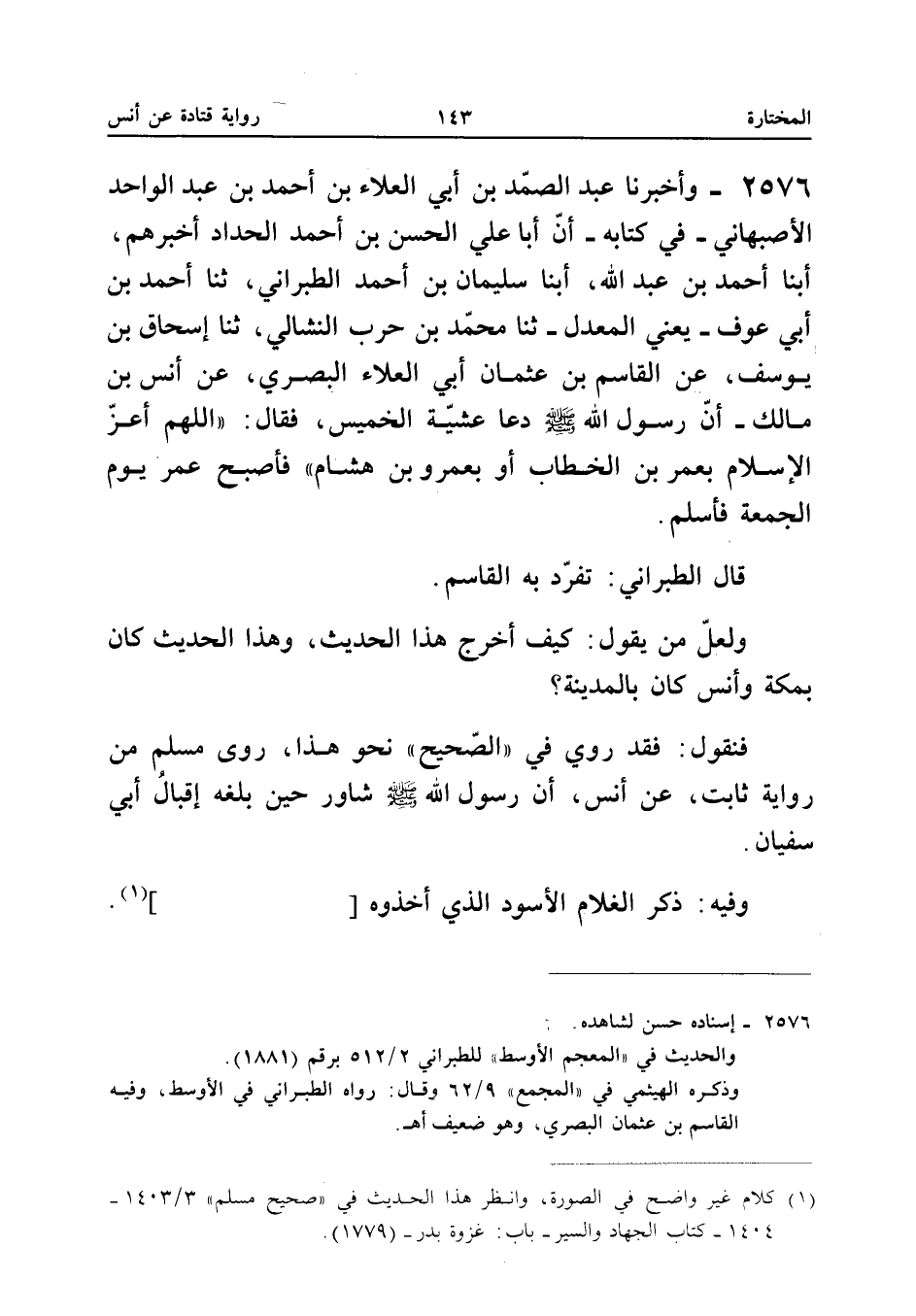 ٢٥٧٦ - وَأَخْبَرَنَا عَبْدُ الصَّمَدِ بْنُ أَبِي الْعَلَاءِ بْنِ أَحْمَدَ بْنِ عَبْدِ الْوَاحِدِ الْأَصْبَهَانِيُّ - فِي كِتَابِهِ - أَنَّ أَبَا عَلِيٍّ الْحَسَنَ بْنَ أَحْمَدَ الْحَدَّادَ أَخْبَرَهُمْ، أَبْنَا أَحْمَدُ بْنُ عَبْدِ اللهِ، أَبْنَا سُلَيْمَانُ بْنُ أَحْمَدَ الطَّبَرَانِيُّ، ثَنَا أَحْمَدُ بْنُ أَبِي عَوْفٍ - يَعْنِي الْمُعَدَّلَ - ثَنَا مُحَمَّدُ بْنُ حَرْبٍ النَّشَّالِيُّ (¬١)، ثَنَا إِسْحَاقُ بْنُ يُوسُفَ، عَنِ الْقَاسِمِ بْنِ عُثْمَانَ أَبِي الْعَلَاءِ الْبَصْرِيِّ، عَنْ أَنَسِ بْنِ مَالِكٍ - «أَنَّ رَسُولَ اللهِ صَلَّى اللهُ عَلَيْهِ وَسَلَّمَ دَعَا عَشِيَّةَ الْخَمِيسِ فَقَالَ: اللَّهُمَّ أَعِزَّ الْإِسْلَامَ بِعُمَرَ بْنِ الْخَطَّابِ أَوْ بِعَمْرِو بْنِ هِشَامٍ، فَأَصْبَحَ عُمَرُ يَوْمَ الْجُمُعَةِ فَأَسْلَمَ».