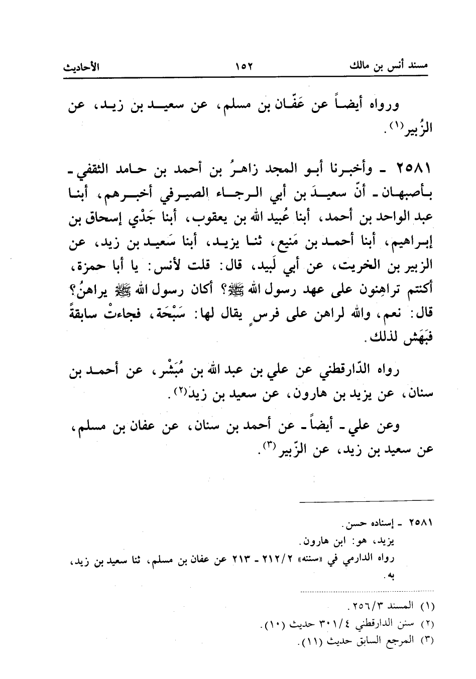٢٥٨١ - وَأَخْبَرَنَا أَبُو الْمَجْدِ زَاهِرُ بْنُ أَحْمَدَ بْنِ حَامِدٍ الثَّقَفِيُّ - بِأَصْبَهَانَ - أَنَّ سَعِيدَ بْنَ أَبِي الرَّجَاءِ الصَّيْرَفِيَّ أَخْبَرَهُمْ، أَبْنَا عَبْدُ الْوَاحِدِ بْنُ أَحْمَدَ، أَبْنَا عُبَيْدُ اللهِ بْنُ يَعْقُوبَ، أَبْنَا جَدِّي إِسْحَاقُ بْنُ إِبْرَاهِيمَ، أَبْنَا أَحْمَدُ بْنُ مَنِيعٍ، ثَنَا يَزِيدُ، أَبْنَا سَعِيدُ بْنُ زَيْدٍ، عَنِ الزُّبَيْرِ بْنِ الْخِرِّيتِ، عَنْ أَبِي لَبِيدٍ، قَالَ: «قُلْتُ لِأَنَسٍ: يَا أَبَا حَمْزَةَ، أَكُنْتُمْ تُرَاهِنُونَ عَلَى عَهْدِ رَسُولِ اللهِ صَلَّى اللهُ عَلَيْهِ وَسَلَّمَ؟ أَكَانَ رَسُولُ اللهِ صَلَّى اللهُ عَلَيْهِ وَسَلَّمَ يُرَاهِنُ؟ قَالَ: نَعَمْ، وَاللهِ لَرَاهَنَ عَلَى فَرَسٍ يُقَالُ لَهَا: سَبْحَةٌ، فَجَاءَتْ سَابِقَةً، فَبَهَشَ لِذَلِكَ».