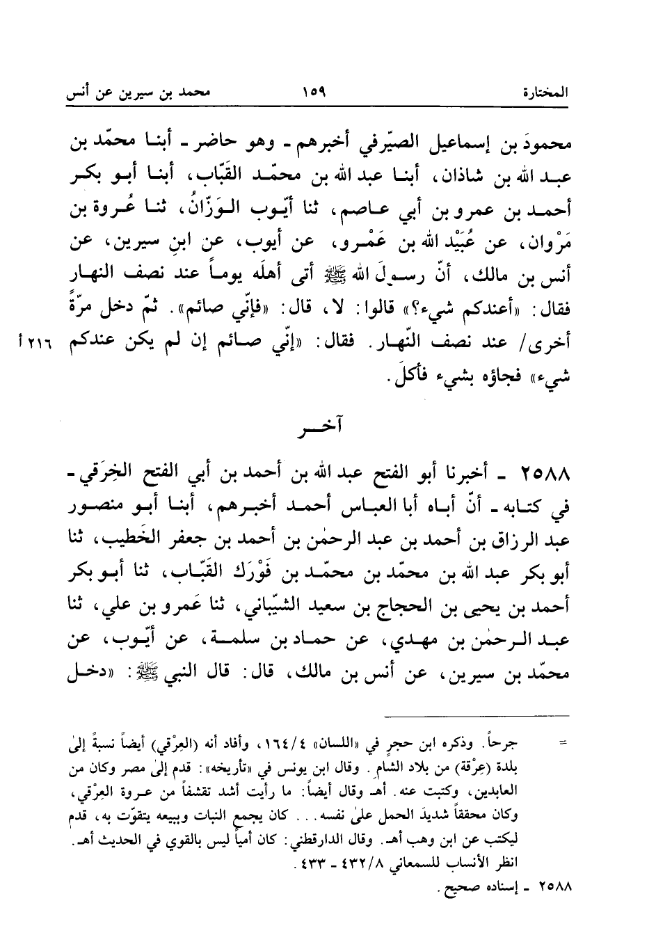 ٢٥٨٨ - أَخْبَرَنَا أَبُو الْفَتْحِ عَبْدُ اللهِ بْنُ أَحْمَدَ بْنِ أَبِي الْفَتْحِ الْخَرَقِيُّ فِي كِتَابِهِ، أَنَّ أَبَاهُ أَبَا الْعَبَّاسِ أَحْمَدَ أَخْبَرَهُمْ، أَبْنَا أَبُو مَنْصُورٍ عَبْدُ الرَّزَّاقِ بْنُ أَحْمَدَ بْنِ عَبْدِ الرَّحْمَنِ بْنِ أَحْمَدَ بْنِ جَعْفَرٍ الْخَطِيبُ، ثَنَا أَبُو بَكْرٍ عَبْدُ اللهِ بْنُ مُحَمَّدِ بْنِ مُحَمَّدِ بْنِ فُورَكَ الْقَبَّابُ، ثَنَا أَبُو بَكْرٍ أَحْمَدُ بْنُ يَحْيَى بْنِ الْحَجَّاجِ بْنِ سَعِيدٍ الشَّيْبَانِيُّ، ثَنَا عَمْرُو بْنُ عَلِيٍّ، ثَنَا عَبْدُ الرَّحْمَنِ بْنُ مَهْدِيٍّ، عَنْ حَمَّادِ بْنِ سَلَمَةَ، عَنْ أَيُّوبَ، عَنْ مُحَمَّدِ بْنِ سِيرِينَ، عَنْ أَنَسِ بْنِ مَالِكٍ، قَالَ: قَالَ النَّبِيُّ صَلَّى اللهُ عَلَيْهِ وَسَلَّمَ: «دَخَلَ