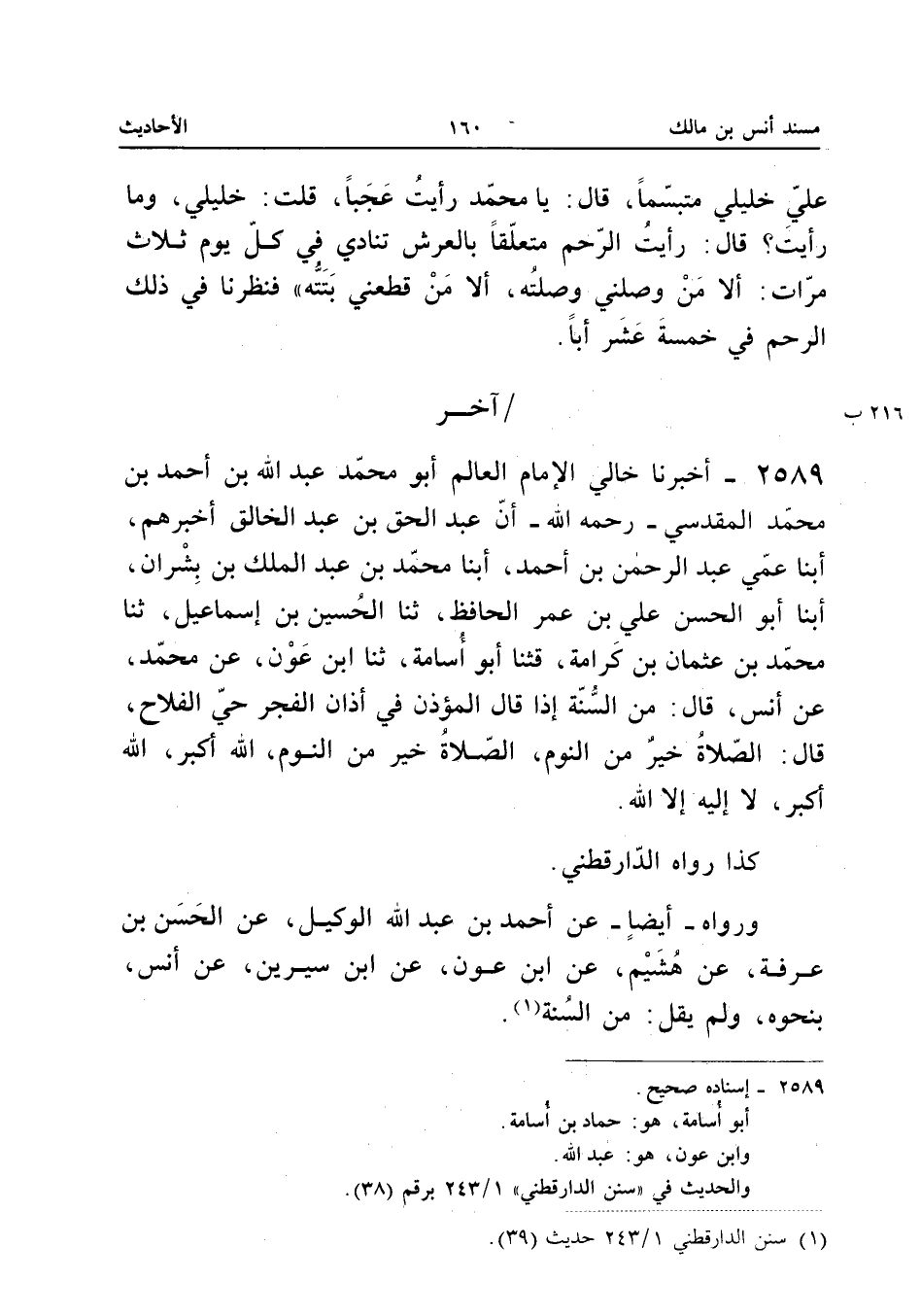 ٢٥٨٩ - أَخْبَرَنَا خَالِي الْإِمَامُ الْعَالِمُ أَبُو مُحَمَّدٍ عَبْدُ اللهِ بْنُ أَحْمَدَ بْنِ مُحَمَّدٍ الْمَقْدِسِيُّ - رَحِمَهُ اللهُ - أَنَّ عَبْدَ الْحَقِّ بْنَ عَبْدِ الْخَالِقِ أَخْبَرَهُمْ، أَبْنَا عَمِّي عَبْدُ الرَّحْمَنِ بْنُ أَحْمَدَ، أَبْنَا مُحَمَّدُ بْنُ عَبْدِ الْمَلِكِ بْنِ بِشْرَانَ، أَبْنَا أَبُو الْحَسَنِ عَلِيُّ بْنُ عُمَرَ الْحَافِظُ، ثَنَا الْحُسَيْنُ بْنُ إِسْمَاعِيلَ، ثَنَا مُحَمَّدُ بْنُ عُثْمَانَ بْنِ كَرَامَةَ، قَثَنَا أَبُو أُسَامَةَ، ثَنَا ابْنُ عَوْنٍ، عَنْ مُحَمَّدٍ، عَنْ أَنَسٍ قَالَ: «مِنَ السُّنَّةِ إِذَا قَالَ الْمُؤَذِّنُ فِي أَذَانِ الْفَجْرِ حَيَّ عَلَى الْفَلَاحِ قَالَ: الصَّلَاةُ خَيْرٌ مِنَ النَّوْمِ، الصَّلَاةُ خَيْرٌ مِنَ النَّوْمِ، اللهُ أَكْبَرُ، اللهُ أَكْبَرُ، لَا إِلَهَ إِلَّا اللهُ».