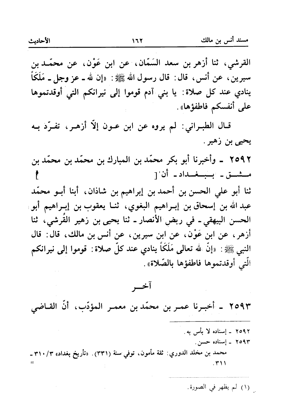 ثَنَا أَبُو عَلِيٍّ الْحَسَنُ بْنُ أَحْمَدَ بْنِ إِبْرَاهِيمَ بْنِ شَاذَانَ، أَبْنَا أَبُو مُحَمَّدٍ عَبْدُ اللهِ بْنُ إِسْحَاقَ بْنِ إِبْرَاهِيمَ الْبَغَوِيُّ، ثَنَا يَعْقُوبُ بْنُ إِبْرَاهِيمَ أَبُو الْحَسَنِ الْبَيْهَقِيُّ - فِي رَبَضِ الْأَنْصَارِ - ثَنَا يَحْيَى بْنُ زُهَيْرٍ الْقُرَشِيُّ، ثَنَا أَزْهَرُ، عَنِ ابْنِ عَوْنٍ، عَنِ ابْنِ سِيرِينَ، عَنْ أَنَسِ بْنِ مَالِكٍ، قَالَ: قَالَ النَّبِيُّ صَلَّى اللهُ عَلَيْهِ وَسَلَّمَ: «إِنَّ لِلهِ تَعَالَى مَلَكًا يُنَادِي عِنْدَ كُلِّ صَلَاةٍ: قُومُوا إِلَى نِيرَانِكُمُ الَّتِي أَوْقَدْتُمُوهَا فَأَطْفِئُوهَا بِالصَّلَاةِ».