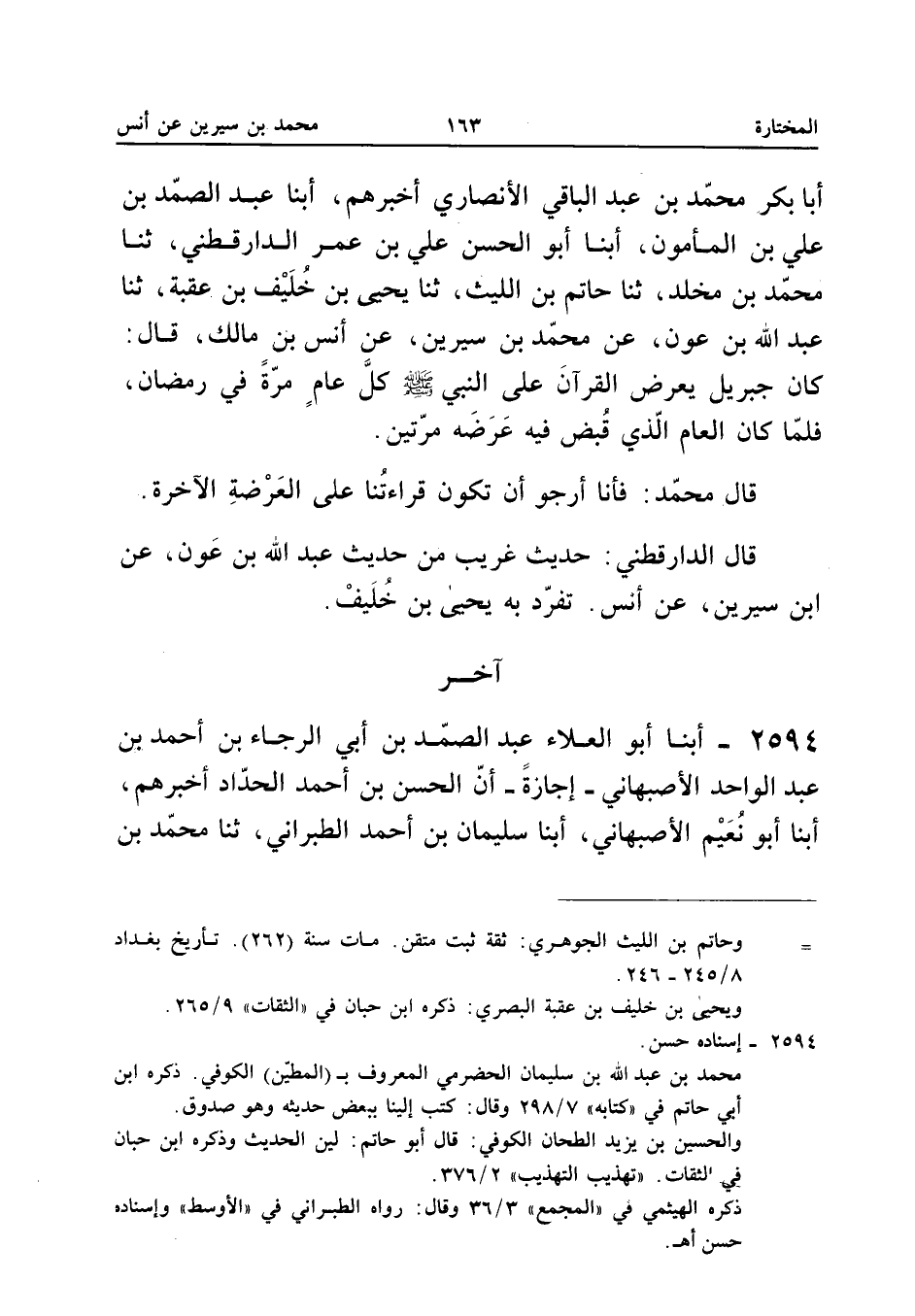 ٢٥٩٤ - أَبْنَا أَبُو الْعَلَاءِ عَبْدُ الصَّمَدِ بْنُ أَبِي الرَّجَاءِ بْنِ أَحْمَدَ بْنِ عَبْدِ الْوَاحِدِ الْأَصْبَهَانِيُّ - إِجَازَةً - أَنَّ الْحَسَنَ بْنَ أَحْمَدَ الْحَدَّادَ أَخْبَرَهُمْ، أَبْنَا أَبُو نُعَيْمٍ الْأَصْبَهَانِيُّ، أَبْنَا سُلَيْمَانُ بْنُ أَحْمَدَ الطَّبَرَانِيُّ، ثَنَا مُحَمَّدُ بْنُ