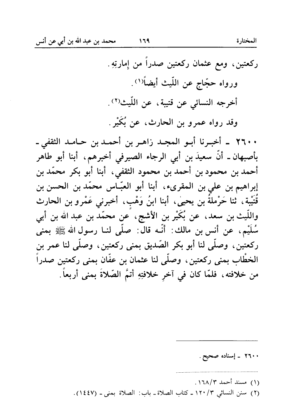 ٢٦٠٠ - أَخْبَرَنَا أَبُو الْمَجْدِ زَاهِرُ بْنُ أَحْمَدَ بْنِ حَامِدٍ الثَّقَفِيُّ - بِأَصْبَهَانَ - أَنَّ سَعِيدَ بْنَ أَبِي الرَّجَاءِ الصَّيْرَفِيَّ أَخْبَرَهُمْ، أَبْنَا أَبُو طَاهِرٍ أَحْمَدُ بْنُ مَحْمُودِ بْنِ أَحْمَدَ بْنِ مَحْمُودٍ الثَّقَفِيُّ، أَبْنَا أَبُو بَكْرٍ مُحَمَّدُ بْنُ إِبْرَاهِيمَ بْنِ عَلِيِّ بْنِ الْمُقْرِئِ، أَبْنَا أَبُو الْعَبَّاسِ مُحَمَّدُ بْنُ الْحَسَنِ بْنِ قُتَيْبَةَ، ثَنَا حَرْمَلَةُ بْنُ يَحْيَى، أَبْنَا ابْنُ وَهْبٍ، أَخْبَرَنِي عَمْرُو بْنُ الْحَارِثِ وَاللَّيْثُ بْنُ سَعْدٍ، عَنْ بُكَيْرِ بْنِ الْأَشَجِّ، عَنْ مُحَمَّدِ بْنِ عَبْدِ اللهِ بْنِ أَبِي سُلَيْمٍ، عَنْ أَنَسِ بْنِ مَالِكٍ أَنَّهُ قَالَ: «صَلَّى لَنَا رَسُولُ اللهِ صَلَّى اللهُ عَلَيْهِ وَسَلَّمَ بِمِنًى رَكْعَتَيْنِ، وَصَلَّى لَنَا أَبُو بَكْرٍ الصِّدِّيقُ بِمِنًى رَكْعَتَيْنِ، وَصَلَّى لَنَا عُمَرُ بْنُ الْخَطَّابِ بِمِنًى رَكْعَتَيْنِ، وَصَلَّى لَنَا عُثْمَانُ بْنُ عَفَّانَ بِمِنًى رَكْعَتَيْنِ صَدْرًا مِنْ خِلَافَتِهِ، فَلَمَّا كَانَ فِي آخِرِ خِلَافَتِهِ أَتَمَّ الصَّلَاةَ بِمِنًى أَرْبَعًا».
