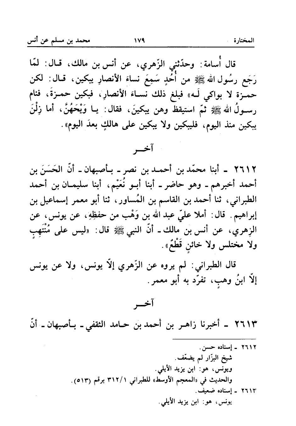 ٢٦١٢ - أَبْنَا مُحَمَّدُ بْنُ أَحْمَدَ بْنِ نَصْرٍ - بِأَصْبَهَانَ - أَنَّ الْحَسَنَ بْنَ أَحْمَدَ أَخْبَرَهُمْ - وَهُوَ حَاضِرٌ - أَبْنَا أَبُو نُعَيْمٍ، أَبْنَا سُلَيْمَانُ بْنُ أَحْمَدَ الطَّبَرَانِيُّ، ثَنَا أَحْمَدُ بْنُ الْقَاسِمِ بْنِ الْمُسَاوِرِ، ثَنَا أَبُو مَعْمَرٍ إِسْمَاعِيلُ بْنُ إِبْرَاهِيمَ قَالَ: أَمْلَى عَلَيَّ عَبْدُ اللهِ بْنُ وَهْبٍ مِنْ حِفْظِهِ، عَنْ يُونُسَ، عَنِ الزُّهْرِيِّ، عَنْ أَنَسِ بْنِ مَالِكٍ أَنَّ النَّبِيَّ صَلَّى اللهُ عَلَيْهِ وَسَلَّمَ قَالَ: «لَيْسَ عَلَى مُنْتَهِبٍ وَلَا مُخْتَلِسٍ وَلَا خَائِنٍ قَطْعٌ».