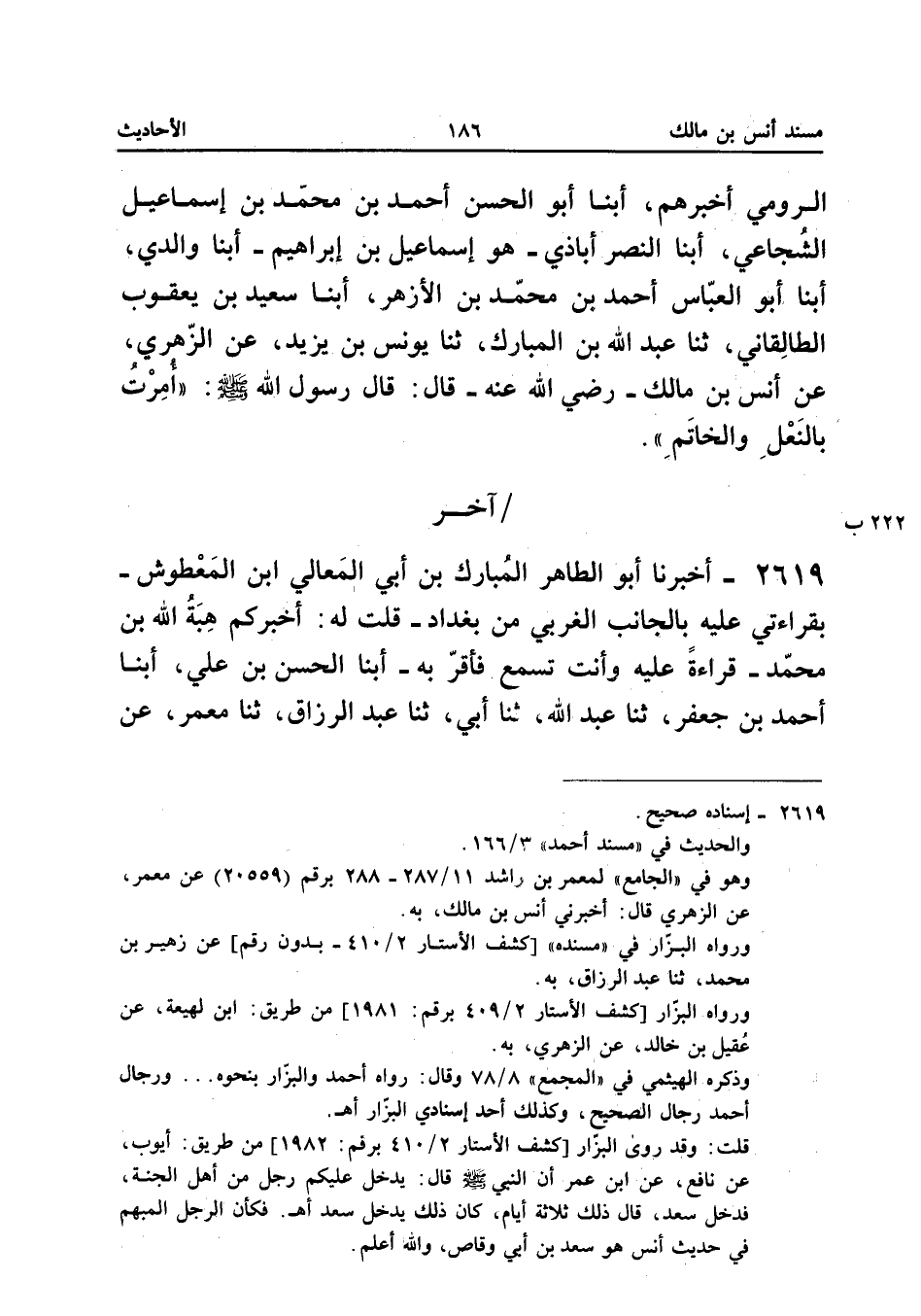 ٢٦١٩ - أَخْبَرَنَا أَبُو الطَّاهِرِ الْمُبَارَكُ بْنُ أَبِي الْمَعَالِي ابْنِ الْمَعْطُوشِ - بِقِرَاءَتِي عَلَيْهِ بِالْجَانِبِ الْغَرْبِيِّ مِنْ بَغْدَادَ - قُلْتُ لَهُ: أَخْبَرَكُمْ هِبَةُ اللهِ بْنُ مُحَمَّدٍ قِرَاءَةً عَلَيْهِ وَأَنْتَ تَسْمَعُ فَأَقَرَّ بِهِ، أَبْنَا الْحَسَنُ بْنُ عَلِيٍّ، أَبْنَا أَحْمَدُ بْنُ جَعْفَرٍ، ثَنَا عَبْدُ اللهِ، ثَنَا أَبِي، ثَنَا عَبْدُ الرَّزَّاقِ، ثَنَا مَعْمَرٌ، عَنِ