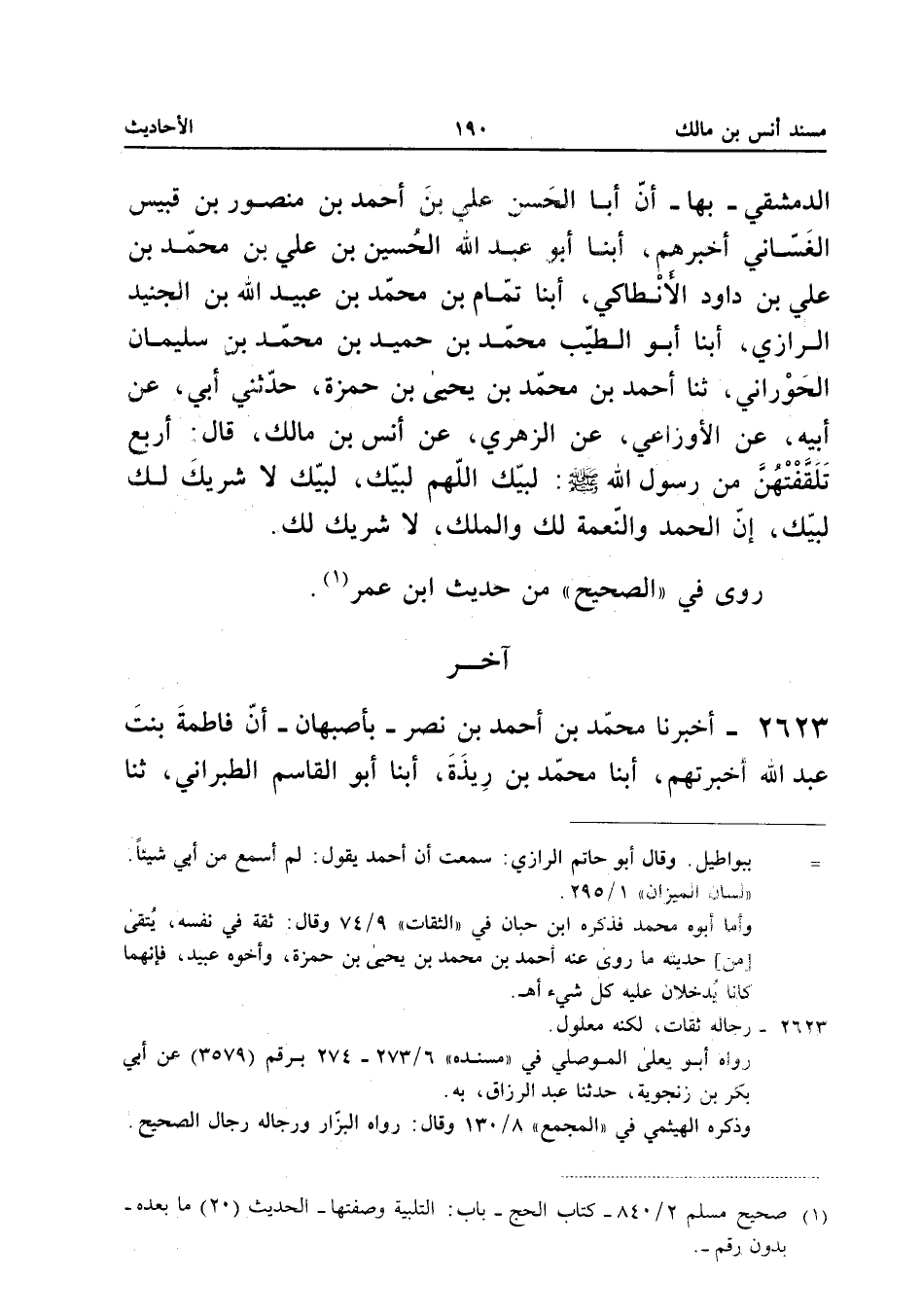 ٢٦٢٣ - أَخْبَرَنَا مُحَمَّدُ بْنُ أَحْمَدَ بْنِ نَصْرٍ - بِأَصْبَهَانَ - أَنَّ فَاطِمَةَ بِنْتَ عَبْدِ اللهِ أَخْبَرَتْهُمْ، أَبْنَا مُحَمَّدُ بْنُ رِيذَةَ، أَبْنَا أَبُو الْقَاسِمِ الطَّبَرَانِيُّ، ثَنَا