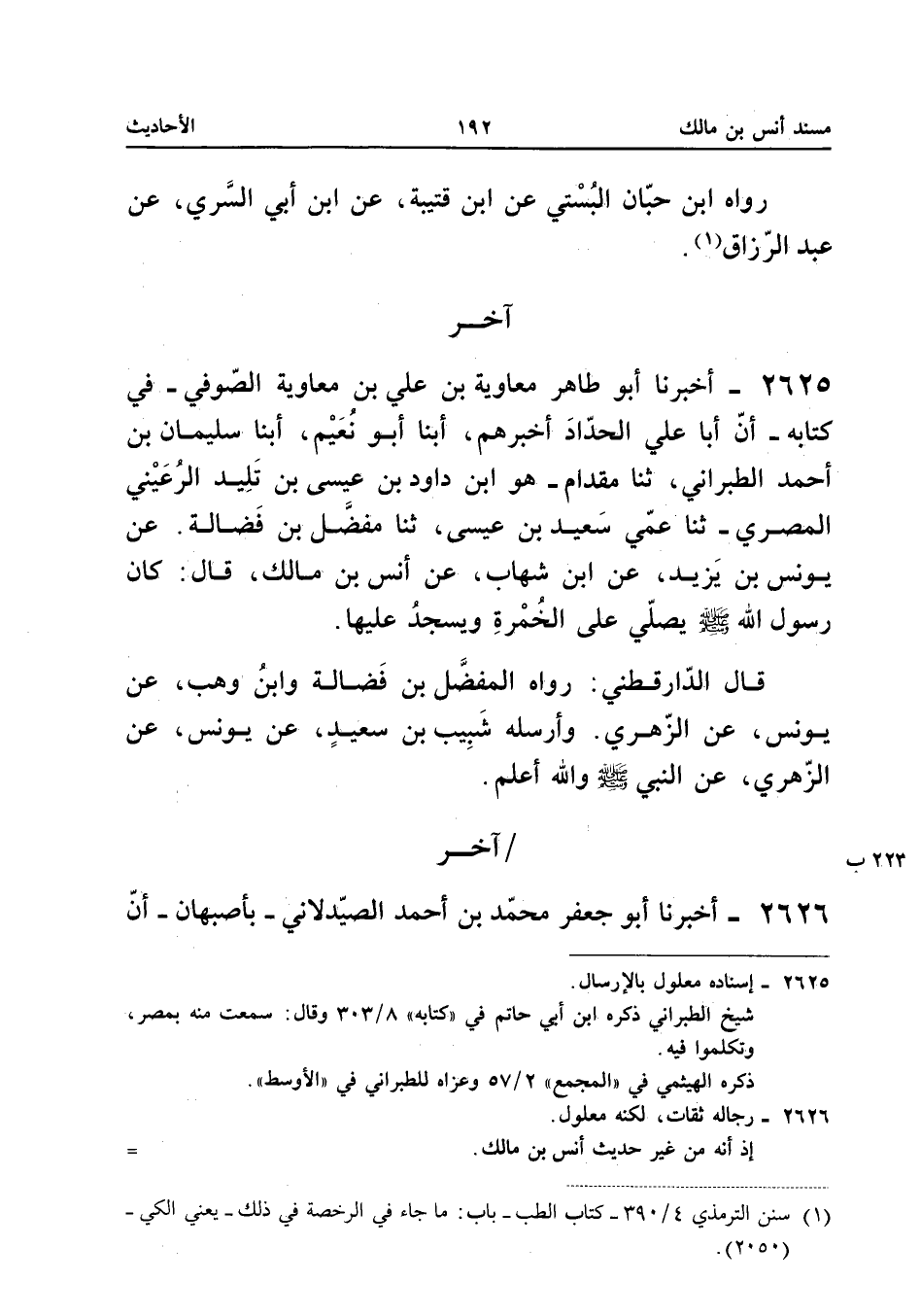 ٢٦٢٥ - أَخْبَرَنَا أَبُو طَاهِرٍ مُعَاوِيَةُ بْنُ عَلِيِّ بْنِ مُعَاوِيَةَ الصُّوفِيُّ فِي كِتَابِهِ أَنَّ أَبَا عَلِيٍّ الْحَدَّادَ أَخْبَرَهُمْ، أَبْنَا أَبُو نُعَيْمٍ، أَبْنَا سُلَيْمَانُ بْنُ أَحْمَدَ الطَّبَرَانِيُّ، ثَنَا مِقْدَامٌ هُوَ ابْنُ دَاوُدَ بْنِ عِيسَى بْنِ تَلِيدٍ الرُّعَيْنِيُّ الْمِصْرِيُّ، ثَنَا عَمِّي سَعِيدُ بْنُ عِيسَى، ثَنَا مُفَضَّلُ بْنُ فَضَالَةَ، عَنْ يُونُسَ بْنِ يَزِيدَ، عَنِ ابْنِ شِهَابٍ، عَنْ أَنَسِ بْنِ مَالِكٍ قَالَ: «كَانَ رَسُولُ اللهِ صَلَّى اللهُ عَلَيْهِ وَسَلَّمَ يُصَلِّي عَلَى الْخُمْرَةِ وَيَسْجُدُ عَلَيْهَا».