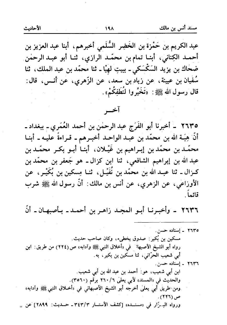 الْحُسَيْنَ بْنَ عَبْدِ الْمَلِكِ أَخْبَرَهُمْ، أَبْنَا إِبْرَاهِيمُ، أَبْنَا مُحَمَّدٌ، أَبْنَا أَبُو يَعْلَى الْمَوْصِلِيُّ، ثَنَا ابْنُ أَبِي شُعَيْبٍ الْحَرَّانِيُّ، ثَنَا مِسْكِينُ بْنُ بُكَيْرٍ، عَنِ الْأَوْزَاعِيِّ، عَنِ ابْنِ شِهَابٍ، عَنْ أَنَسٍ: «أَنَّ النَّبِيَّ صَلَّى اللهُ عَلَيْهِ وَسَلَّمَ شَرِبَ قَائِمًا».