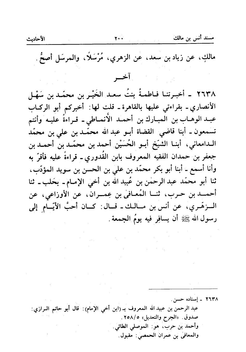 ٢٦٣٨ - أَخْبَرَتْنَا فَاطِمَةُ بِنْتُ سَعْدِ الْخَيْرِ بْنِ مُحَمَّدِ بْنِ سَهْلٍ الْأَنْصَارِيِّ - بِقِرَاءَتِي عَلَيْهَا بِالْقَاهِرَةِ - قُلْتُ لَهَا: أَخْبَرَكُمْ أَبُو الرِّكَابِ عَبْدُ الْوَهَّابِ بْنُ الْمُبَارَكِ بْنِ أَحْمَدَ الْأَنْمَاطِيُّ - قِرَاءَةً عَلَيْهِ وَأَنْتُمْ تَسْمَعُونَ - أَبْنَا قَاضِي الْقُضَاةِ أَبُو عَبْدِ اللهِ مُحَمَّدُ بْنُ عَلِيِّ بْنِ مُحَمَّدٍ الدَّامَغَانِيُّ، أَبْنَا الشَّيْخُ أَبُو الْحُسَيْنِ أَحْمَدُ بْنُ مُحَمَّدِ بْنِ أَحْمَدَ بْنِ جَعْفَرِ بْنِ حَمْدَانَ الْفَقِيهُ الْمَعْرُوفُ بِابْنِ الْقُدُورِيِّ - قِرَاءَةً عَلَيْهِ فَأَقَرَّ بِهِ وَأَنَا أَسْمَعُ - أَبْنَا أَبُو بَكْرٍ مُحَمَّدُ بْنُ عَلِيِّ بْنِ الْحَسَنِ بْنِ سُوَيْدٍ الْمُؤَدِّبُ، ثَنَا أَبُو مُحَمَّدٍ عَبْدُ الرَّحْمَنِ بْنُ عُبَيْدِ اللهِ بْنِ أَخِي الْإِمَامِ بِحَلَبَ، ثَنَا أَحْمَدُ بْنُ حَرْبٍ، ثَنَا الْمُعَافَى بْنُ عِمْرَانَ، عَنِ الْأَوْزَاعِيِّ، عَنِ الزُّهْرِيِّ، عَنْ أَنَسِ بْنِ مَالِكٍ قَالَ: «كَانَ أَحَبَّ الْأَيَّامِ إِلَى رَسُولِ اللهِ صَلَّى اللهُ عَلَيْهِ وَسَلَّمَ أَنْ يُسَافِرَ فِيهِ يَوْمُ الْجُمُعَةِ».