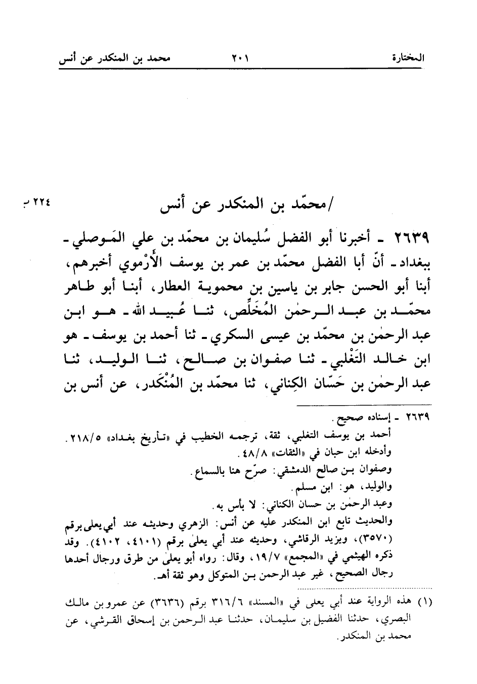 ٢٦٣٩ - أَخْبَرَنَا أَبُو الْفَضْلِ سُلَيْمَانُ بْنُ مُحَمَّدِ بْنِ عَلِيٍّ الْمَوْصِلِيُّ - بِبَغْدَادَ - أَنَّ أَبَا الْفَضْلِ مُحَمَّدَ بْنَ عُمَرَ بْنِ يُوسُفَ الْأُرْمَوِيَّ أَخْبَرَهُمْ، أَبْنَا أَبُو الْحَسَنِ جَابِرُ بْنُ يَاسِينَ بْنِ مَحْمَوَيْهِ الْعَطَّارُ، أَبْنَا أَبُو طَاهِرٍ مُحَمَّدُ بْنُ عَبْدِ الرَّحْمَنِ الْمُخَلِّصُ، ثَنَا عُبَيْدُ اللهِ هُوَ ابْنُ عَبْدِ الرَّحْمَنِ بْنِ مُحَمَّدِ بْنِ عِيسَى السُّكَّرِيُّ، ثَنَا أَحْمَدُ بْنُ يُوسُفَ هُوَ ابْنُ خَالِدٍ التَّغْلِبِيُّ، ثَنَا صَفْوَانُ بْنُ صَالِحٍ، ثَنَا الْوَلِيدُ، ثَنَا عَبْدُ الرَّحْمَنِ بْنُ حَسَّانَ الْكِنَانِيُّ، ثَنَا مُحَمَّدُ بْنُ الْمُنْكَدِرِ، عَنْ أَنَسِ بْنِ