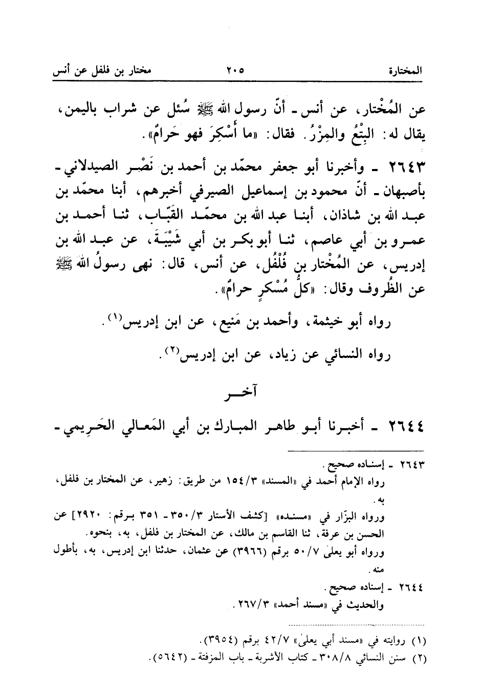 ٢٦٤٣ - وَأَخْبَرَنَا أَبُو جَعْفَرٍ مُحَمَّدُ بْنُ أَحْمَدَ بْنِ نَصْرٍ الصَّيْدَلَانِيُّ - بِأَصْبَهَانَ - أَنَّ مَحْمُودَ بْنَ إِسْمَاعِيلَ الصَّيْرَفِيَّ أَخْبَرَهُمْ، أَبْنَا مُحَمَّدُ بْنُ عَبْدِ اللهِ بْنِ شَاذَانَ، أَبْنَا عَبْدُ اللهِ بْنُ مُحَمَّدٍ الْقَبَّابُ، ثَنَا أَحْمَدُ بْنُ عَمْرِو بْنِ أَبِي عَاصِمٍ، ثَنَا أَبُو بَكْرِ بْنُ أَبِي شَيْبَةَ، عَنْ عَبْدِ اللهِ بْنِ إِدْرِيسَ، عَنِ الْمُخْتَارِ بْنِ فُلْفُلٍ، عَنْ أَنَسٍ قَالَ: «نَهَى رَسُولُ اللهِ صَلَّى اللهُ عَلَيْهِ وَسَلَّمَ عَنِ الظُّرُوفِ وَقَالَ: كُلُّ مُسْكِرٍ حَرَامٌ».
