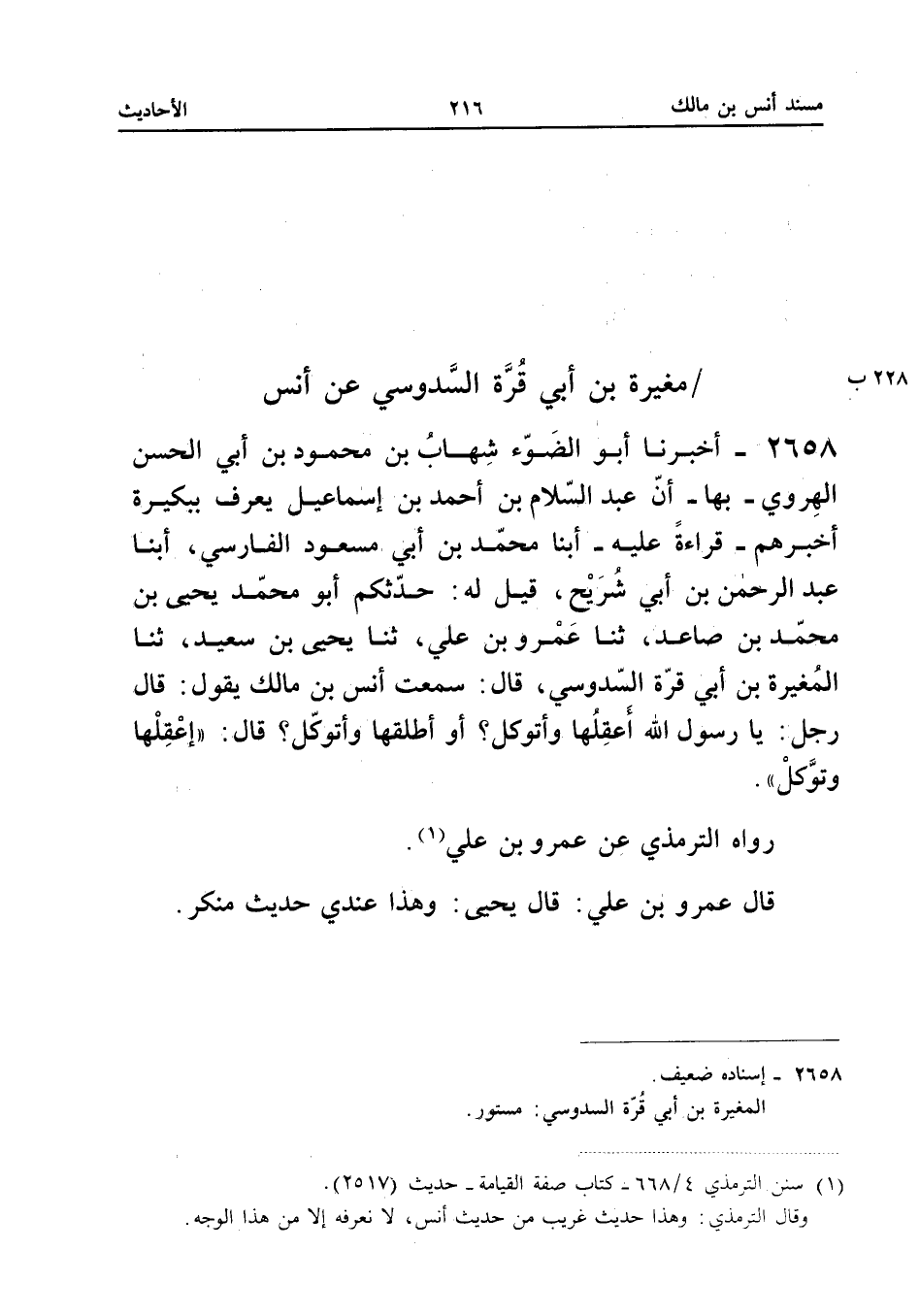 ٢٦٥٨ - أَخْبَرَنَا أَبُو الضَّوْءِ شِهَابُ بْنُ مَحْمُودِ بْنِ أَبِي الْحَسَنِ الْهَرَوِيُّ - بِهَا - أَنَّ عَبْدَ السَّلَامِ بْنَ أَحْمَدَ بْنِ إِسْمَاعِيلَ يُعْرَفُ بِبُكَيْرَةَ أَخْبَرَهُمْ - قِرَاءَةً عَلَيْهِ - أَبْنَا مُحَمَّدُ بْنُ أَبِي مَسْعُودٍ الْفَارِسِيُّ، أَبْنَا عَبْدُ الرَّحْمَنِ بْنُ أَبِي شُرَيْحٍ قِيلَ لَهُ: حَدَّثَكُمْ أَبُو مُحَمَّدٍ يَحْيَى بْنُ مُحَمَّدِ بْنِ صَاعِدٍ، ثَنَا عَمْرُو بْنُ عَلِيٍّ، ثَنَا يَحْيَى بْنُ سَعِيدٍ، ثَنَا الْمُغِيرَةُ بْنُ أَبِي قُرَّةَ السَّدُوسِيُّ، قَالَ: سَمِعْتُ أَنَسَ بْنَ مَالِكٍ يَقُولُ: «قَالَ رَجُلٌ: يَا رَسُولَ اللهِ، أَعْقِلُهَا وَأَتَوَكَّلُ، أَوْ أُطْلِقُهَا وَأَتَوَكَّلُ؟ قَالَ: اعْقِلْهَا وَتَوَكَّلْ».
