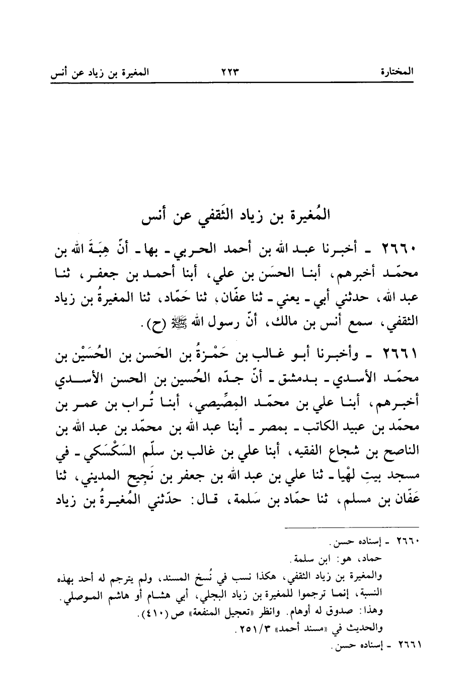 ٢٦٦٠ - أَخْبَرَنَا عَبْدُ اللهِ بْنُ أَحْمَدَ الْحَرْبِيُّ - بِهَا - أَنَّ هِبَةَ اللهِ بْنَ مُحَمَّدٍ أَخْبَرَهُمْ، أَبْنَا الْحَسَنُ بْنُ عَلِيٍّ، أَبْنَا أَحْمَدُ بْنُ جَعْفَرٍ، ثَنَا عَبْدُ اللهِ، حَدَّثَنِي أَبِي - يَعْنِي - ثَنَا عَفَّانُ، ثَنَا حَمَّادٌ، ثَنَا الْمُغِيرَةُ بْنُ زِيَادٍ الثَّقَفِيُّ، سَمِعَ أَنَسَ بْنَ مَالِكٍ، أَنَّ رَسُولَ اللهِ صَلَّى اللهُ عَلَيْهِ وَسَلَّمَ (ح).