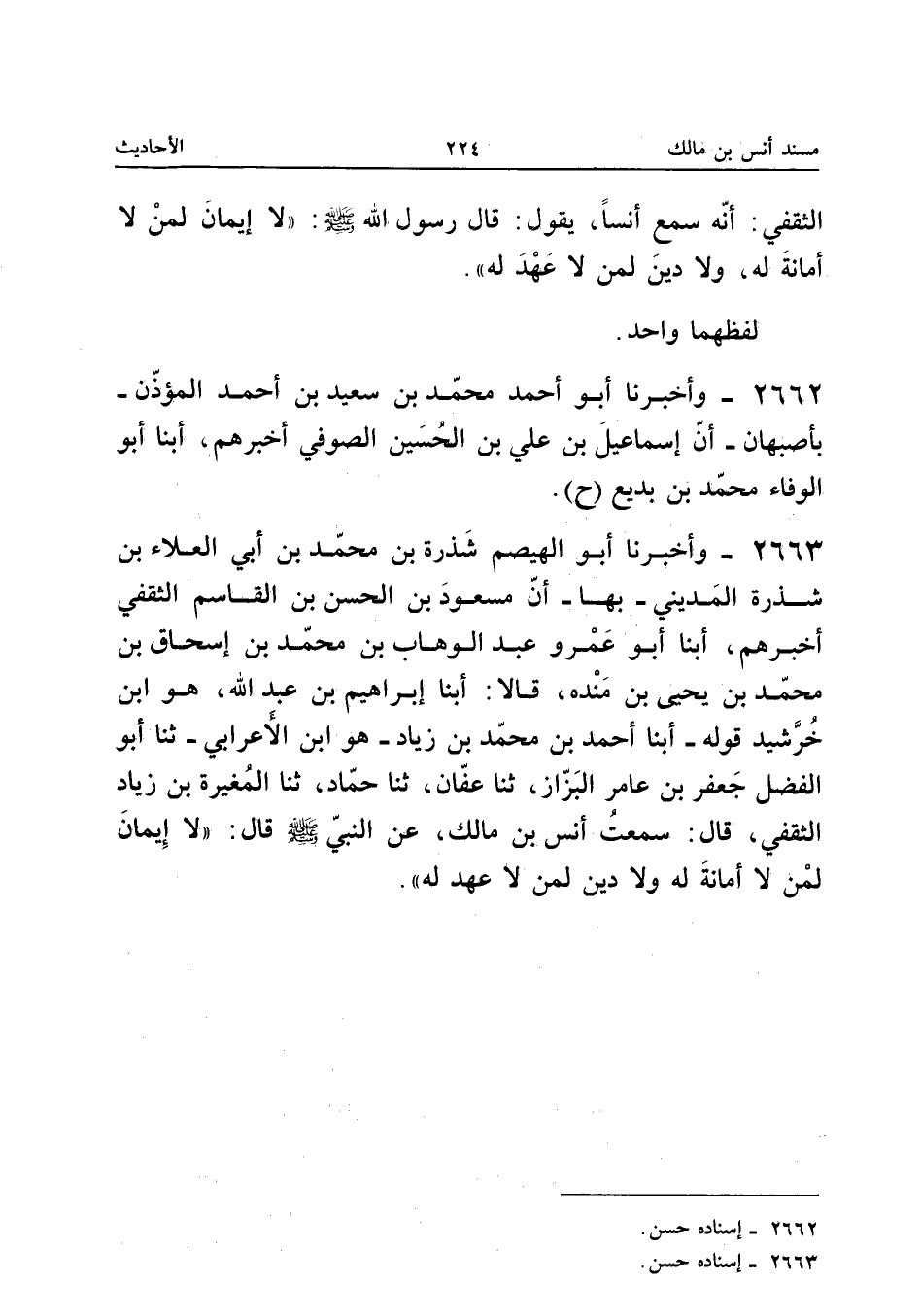 ٢٦٦٣ - وَأَخْبَرَنَا أَبُو الْهَيْصَمِ شَذْرَةُ بْنُ مُحَمَّدِ بْنِ أَبِي الْعَلَاءِ بْنِ شَذْرَةَ الْمَدِينِيُّ - بِهَا - أَنَّ مَسْعُودَ بْنَ الْحَسَنِ بْنِ الْقَاسِمِ الثَّقَفِيَّ أَخْبَرَهُمْ، أَبْنَا أَبُو عَمْرٍو عَبْدُ الْوَهَّابِ بْنُ مُحَمَّدِ بْنِ إِسْحَاقَ بْنِ مُحَمَّدِ بْنِ يَحْيَى بْنِ مَنْدَهْ قَالَا: أَبْنَا إِبْرَاهِيمُ بْنُ عَبْدِ اللهِ هُوَ ابْنُ خُرْشَيْدَ قَوْلَهُ، أَبْنَا أَحْمَدُ بْنُ مُحَمَّدِ بْنِ زِيَادٍ هُوَ ابْنُ الْأَعْرَابِيِّ، ثَنَا أَبُو الْفَضْلِ جَعْفَرُ بْنُ عَامِرٍ الْبَزَّازُ، ثَنَا عَفَّانُ، ثَنَا حَمَّادٌ، ثَنَا الْمُغِيرَةُ بْنُ زِيَادٍ الثَّقَفِيُّ قَالَ: سَمِعْتُ أَنَسَ بْنَ مَالِكٍ، عَنِ النَّبِيِّ صَلَّى اللهُ عَلَيْهِ وَسَلَّمَ قَالَ: «لَا إِيمَانَ لِمَنْ لَا أَمَانَةَ لَهُ، وَلَا دِينَ لِمَنْ لَا عَهْدَ لَهُ».