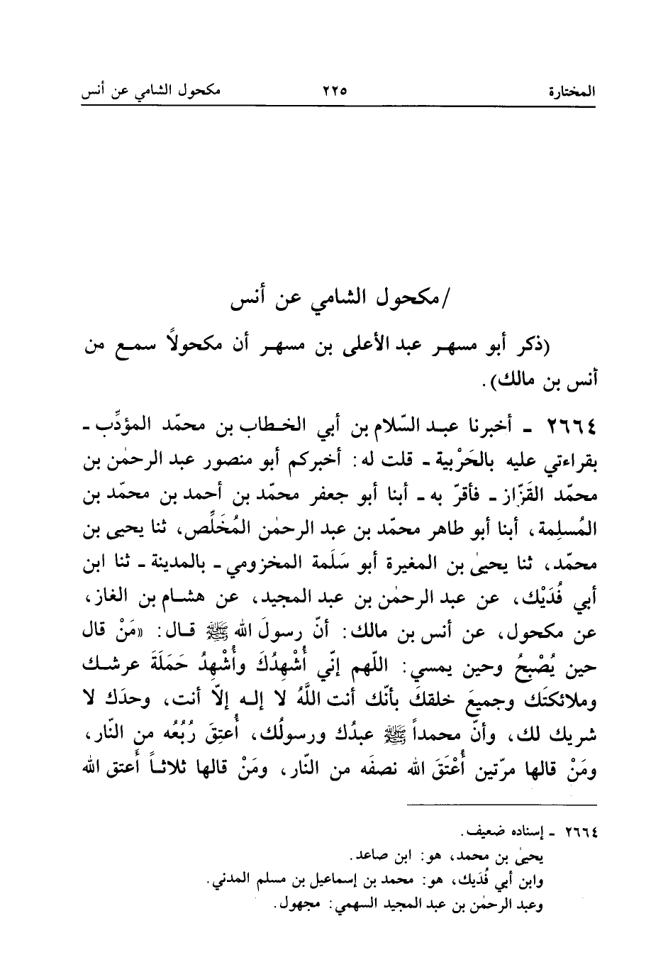 ٢٦٦٤ - أَخْبَرَنَا عَبْدُ السَّلَامِ بْنُ أَبِي الْخَطَّابِ بْنِ مُحَمَّدٍ الْمُؤَدِّبُ - بِقِرَاءَتِي عَلَيْهِ بِالْحَرْبِيَّةِ - قُلْتُ لَهُ: أَخْبَرَكُمْ أَبُو مَنْصُورٍ عَبْدُ الرَّحْمَنِ بْنُ مُحَمَّدٍ الْقَزَّازُ فَأَقَرَّ بِهِ، أَبْنَا أَبُو جَعْفَرٍ مُحَمَّدُ بْنُ أَحْمَدَ بْنِ مُحَمَّدِ بْنِ الْمُسْلِمَةِ، أَبْنَا أَبُو طَاهِرٍ مُحَمَّدُ بْنُ عَبْدِ الرَّحْمَنِ الْمُخَلِّصُ، ثَنَا يَحْيَى بْنُ مُحَمَّدٍ، ثَنَا يَحْيَى بْنُ الْمُغِيرَةِ أَبُو سَلَمَةَ الْمَخْزُومِيُّ بِالْمَدِينَةِ، ثَنَا ابْنُ أَبِي فُدَيْكٍ، عَنْ عَبْدِ الرَّحْمَنِ بْنِ عَبْدِ الْمَجِيدِ، عَنْ هِشَامِ بْنِ الْغَازِ، عَنْ مَكْحُولٍ، عَنْ أَنَسِ بْنِ مَالِكٍ، أَنَّ رَسُولَ اللهِ صَلَّى اللهُ عَلَيْهِ وَسَلَّمَ قَالَ: «مَنْ قَالَ حِينَ يُصْبِحُ وَحِينَ يُمْسِي: اللَّهُمَّ إِنِّي أُشْهِدُكَ وَأُشْهِدُ حَمَلَةَ عَرْشِكَ وَمَلَائِكَتَكَ وَجَمِيعَ خَلْقِكَ بِأَنَّكَ أَنْتَ اللهُ لَا إِلَهَ إِلَّا أَنْتَ وَحْدَكَ لَا شَرِيكَ لَكَ، وَأَنَّ مُحَمَّدًا صَلَّى اللهُ عَلَيْهِ وَسَلَّمَ عَبْدُكَ وَرَسُولُكَ، أُعْتِقَ رُبُعُهُ مِنَ النَّارِ، وَمَنْ قَالَهَا مَرَّتَيْنِ أَعْتَقَ اللهُ نِصْفَهُ مِنَ النَّارِ، وَمَنْ قَالَهَا ثَلَاثًا أَعْتَقَ اللهُ