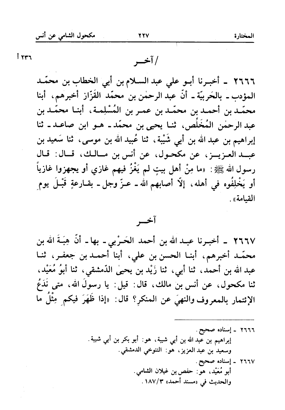 ٢٦٦٧ - أَخْبَرَنَا عَبْدُ اللهِ بْنُ أَحْمَدَ الْحَرْبِيُّ - بِهَا - أَنَّ هِبَةَ اللهِ بْنَ مُحَمَّدٍ أَخْبَرَهُمْ، أَبْنَا الْحَسَنُ بْنُ عَلِيٍّ، أَبْنَا أَحْمَدُ بْنُ جَعْفَرٍ، ثَنَا عَبْدُ اللهِ بْنُ أَحْمَدَ، ثَنَا أَبِي، ثَنَا زَيْدُ بْنُ يَحْيَى الدِّمَشْقِيُّ، ثَنَا أَبُو مُعَيْدٍ، ثَنَا مَكْحُولٌ، عَنْ أَنَسِ بْنِ مَالِكٍ قَالَ: «قِيلَ يَا رَسُولَ اللهِ: مَتَى نَدَعُ الِائْتِمَارَ بِالْمَعْرُوفِ وَالنَّهْيَ عَنِ الْمُنْكَرِ؟ قَالَ: إِذَا ظَهَرَ فِيكُمْ مِثْلُ مَا