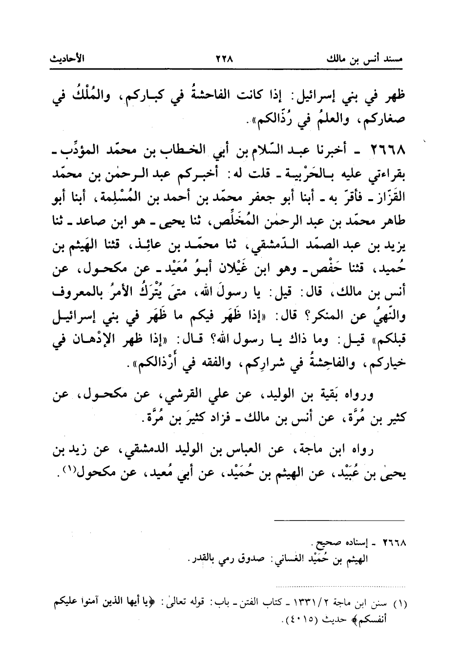 ٢٦٦٨ - أَخْبَرَنَا عَبْدُ السَّلَامِ بْنُ أَبِي الْخَطَّابِ بْنِ مُحَمَّدٍ الْمُؤَدِّبُ بِقِرَاءَتِي عَلَيْهِ بِالْحَرْبِيَّةِ قُلْتُ لَهُ: أَخْبَرَكُمْ عَبْدُ الرَّحْمَنِ بْنُ مُحَمَّدٍ الْقَزَّازُ فَأَقَرَّ بِهِ، أَبْنَا أَبُو جَعْفَرٍ مُحَمَّدُ بْنُ أَحْمَدَ بْنِ الْمُسْلِمَةِ، أَبْنَا أَبُو طَاهِرٍ مُحَمَّدُ بْنُ عَبْدِ الرَّحْمَنِ الْمُخَلِّصُ، ثَنَا يَحْيَى هُوَ ابْنُ صَاعِدٍ، ثَنَا يَزِيدُ بْنُ عَبْدِ الصَّمَدِ الدِّمَشْقِيُّ، ثَنَا مُحَمَّدُ بْنُ عَائِذٍ، قَثَنَا الْهَيْثَمُ بْنُ حُمَيْدٍ، قَثَنَا حَفْصٌ وَهُوَ ابْنُ غَيْلَانَ أَبُو مُعَيْدٍ، عَنْ مَكْحُولٍ، عَنْ أَنَسِ بْنِ مَالِكٍ قَالَ: «قِيلَ: يَا رَسُولَ اللهِ، مَتَى يُتْرَكُ الْأَمْرُ بِالْمَعْرُوفِ وَالنَّهْيُ عَنِ الْمُنْكَرِ؟ قَالَ: إِذَا ظَهَرَ فِيكُمْ مَا ظَهَرَ فِي بَنِي إِسْرَائِيلَ قَبْلَكُمْ، قِيلَ: وَمَا ذَاكَ يَا رَسُولَ اللهِ؟ قَالَ: إِذَا ظَهَرَ الْإِدْهَانُ فِي خِيَارِكُمْ، وَالْفَاحِشَةُ فِي شِرَارِكُمْ، وَالْفِقْهُ فِي أَرْذَالِكُمْ».