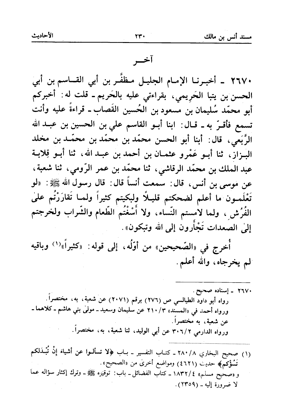 أَخْبَرَنَا الْإِمَامُ الْجَلِيلُ مُظَفَّرُ بْنُ أَبِي الْقَاسِمِ بْنِ أَبِي الْحَسَنِ بْنِ يَتَبَا الْحَرِيمِيُّ - بِقِرَاءَتِي عَلَيْهِ بِالْحَرِيمِ - قُلْتُ لَهُ: أَخْبَرَكُمْ أَبُو مُحَمَّدٍ سُلَيْمَانُ بْنُ مَسْعُودِ بْنِ الْحُسَيْنِ الْقَصَّابُ (¬١) - قِرَاءَةً عَلَيْهِ وَأَنْتَ تَسْمَعُ فَأَقَرَّ بِهِ - قَالَ: أَبْنَا أَبُو الْقَاسِمِ عَلِيُّ بْنُ الْحُسَيْنِ بْنِ عَبْدِ اللهِ الرَّبَعِيُّ، قَالَ: أَبْنَا أَبُو الْحَسَنِ مُحَمَّدُ بْنُ مُحَمَّدِ بْنِ مُحَمَّدِ بْنِ مَخْلَدٍ الْبَزَّازُ، ثَنَا أَبُو عَمْرٍو عُثْمَانُ بْنُ أَحْمَدَ بْنِ عَبْدِ اللهِ، ثَنَا أَبُو قِلَابَةَ عَبْدُ الْمَلِكِ بْنُ مُحَمَّدٍ الرَّقَاشِيُّ، ثَنَا مُحَمَّدُ بْنُ عُمَرَ الرُّومِيُّ، ثَنَا شُعْبَةُ، عَنْ مُوسَى بْنِ أَنَسٍ، قَالَ: سَمِعْتُ أَنَسًا قَالَ: قَالَ رَسُولُ اللهِ صَلَّى اللهُ عَلَيْهِ وَسَلَّمَ: «لَوْ تَعْلَمُونَ مَا أَعْلَمُ لَضَحِكْتُمْ قَلِيلًا، وَلَبَكَيْتُمْ كَثِيرًا، وَلِمَا تَقَارَرْتُمْ عَلَى الْفُرُشِ، وَلَمَا لَامَسْتُمُ النِّسَاءَ، وَلَا أَسَغْتُمُ الطَّعَامَ وَالشَّرَابَ، وَلَخَرَجْتُمْ إِلَى الصُّعُدَاتِ تَجْأَرُونَ إِلَى اللهِ وَتَبْكُونَ».