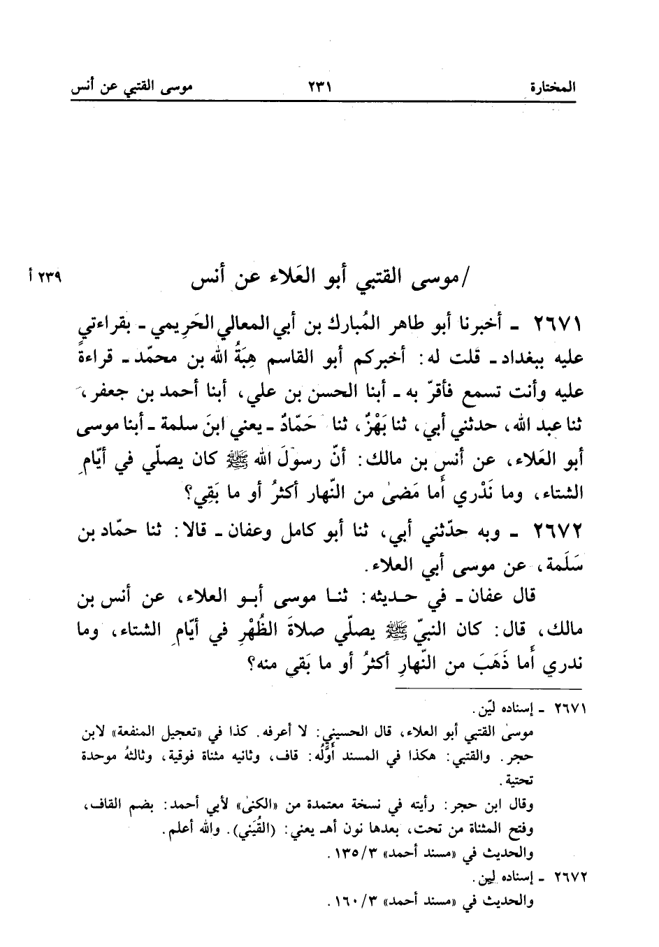 ٢٦٧١ - أَخْبَرَنَا أَبُو طَاهِرٍ الْمُبَارَكُ بْنُ أَبِي الْمَعَالِي الْحَرِيمِيُّ - بِقِرَاءَتِي عَلَيْهِ بِبَغْدَادَ - قُلْتُ لَهُ: أَخْبَرَكُمْ أَبُو الْقَاسِمِ هِبَةُ اللهِ بْنُ مُحَمَّدٍ - قِرَاءَةً عَلَيْهِ وَأَنْتَ تَسْمَعُ فَأَقَرَّ بِهِ - أَبْنَا الْحَسَنُ بْنُ عَلِيٍّ، أَبْنَا أَحْمَدُ بْنُ جَعْفَرٍ، ثَنَا عَبْدُ اللهِ، حَدَّثَنِي أَبِي، ثَنَا بَهْزٌ، ثَنَا حَمَّادٌ - يَعْنِي ابْنَ سَلَمَةَ - أَبْنَا مُوسَى أَبُو الْعَلَاءِ، عَنْ أَنَسِ بْنِ مَالِكٍ: أَنَّ رَسُولَ اللهِ صَلَّى اللهُ عَلَيْهِ وَسَلَّمَ «كَانَ يُصَلِّي فِي أَيَّامِ الشِّتَاءِ، وَمَا نَدْرِي أَمَا مَضَى مِنَ النَّهَارِ أَكْثَرُ أَوْ مَا بَقِيَ».