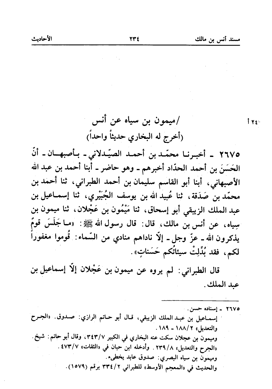 ٢٦٧٥ - أَخْبَرَنَا مُحَمَّدُ بْنُ أَحْمَدَ الصَّيْدَلَانِيُّ - بِأَصْبَهَانَ - أَنَّ الْحَسَنَ بْنَ أَحْمَدَ الْحَدَّادَ أَخْبَرَهُمْ - وَهُوَ حَاضِرٌ - أَبْنَا أَحْمَدُ بْنُ عَبْدِ اللهِ الْأَصْبَهَانِيُّ، أَبْنَا أَبُو الْقَاسِمِ سُلَيْمَانُ بْنُ أَحْمَدَ الطَّبَرَانِيُّ، ثَنَا أَحْمَدُ بْنُ مُحَمَّدِ بْنِ صَدَقَةَ، ثَنَا عُبَيْدُ اللهِ بْنُ يُوسُفَ الْجُبَيْرِيُّ، ثَنَا إِسْمَاعِيلُ بْنُ عَبْدِ الْمَلِكِ الزِّيبَقِيُّ أَبُو إِسْحَاقَ، ثَنَا مَيْمُونُ بْنُ عَجْلَانَ، ثَنَا مَيْمُونُ بْنُ سِيَاهٍ، عَنْ أَنَسِ بْنِ مَالِكٍ، قَالَ: قَالَ رَسُولُ اللهِ صَلَّى اللهُ عَلَيْهِ وَسَلَّمَ: «مَا جَلَسَ قَوْمٌ يَذْكُرُونَ اللهَ عَزَّ وَجَلَّ إِلَّا نَادَاهُمْ مُنَادٍ مِنَ السَّمَاءِ: قُومُوا مَغْفُورًا لَكُمْ، فَقَدْ بُدِّلَتْ سَيِّئَاتُكُمْ حَسَنَاتٍ».