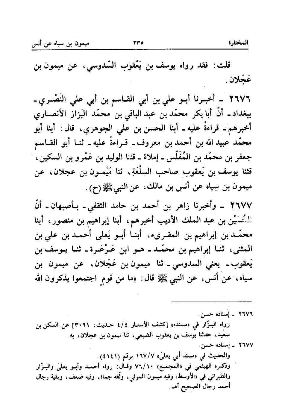 ٢٦٧٦ - أَخْبَرَنَا أَبُو عَلِيِّ بْنُ أَبِي الْقَاسِمِ بْنِ أَبِي عَلِيٍّ النَّصْرِيُّ - بِبَغْدَادَ - أَنَّ أَبَا بَكْرٍ مُحَمَّدَ بْنَ عَبْدِ الْبَاقِي بْنِ مُحَمَّدِ الْبَزَّازَ الْأَنْصَارِيَّ أَخْبَرَهُمْ - قِرَاءَةً عَلَيْهِ - أَبْنَا الْحَسَنُ بْنُ عَلِيٍّ الْجَوْهَرِيُّ قَالَ: أَبْنَا أَبُو مُحَمَّدٍ عُبَيْدُ اللهِ بْنُ أَحْمَدَ بْنِ مَعْرُوفٍ - قِرَاءَةً عَلَيْهِ - ثَنَا أَبُو الْقَاسِمِ جَعْفَرُ بْنُ مُحَمَّدِ بْنِ الْمُفْلِسِ إِمْلَاءً، قَثَنَا الْوَلِيدُ بْنُ عَمْرِو بْنِ السُّكَيْنِ، قَثَنَا يُوسُفُ بْنُ يَعْقُوبَ صَاحِبُ السِّلْعَةِ، ثَنَا مَيْمُونُ بْنُ عَجْلَانَ، عَنْ مَيْمُونِ بْنِ سِيَاهٍ، عَنْ أَنَسِ بْنِ مَالِكٍ، عَنِ النَّبِيِّ صَلَّى اللهُ عَلَيْهِ وَسَلَّمَ (ح).