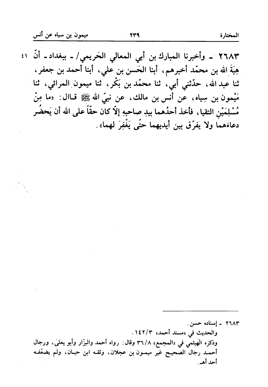 ٢٦٨٣ - وَأَخْبَرَنَا الْمُبَارَكُ بْنُ أَبِي الْمَعَالِي الْحَرِيمِيُّ - بِبَغْدَادَ - أَنَّ هِبَةَ اللهِ بْنَ مُحَمَّدٍ أَخْبَرَهُمْ، أَبْنَا الْحَسَنُ بْنُ عَلِيٍّ، أَبْنَا أَحْمَدُ بْنُ جَعْفَرٍ، ثَنَا عَبْدُ اللهِ، حَدَّثَنِي أَبِي، ثَنَا مُحَمَّدُ بْنُ بَكْرٍ، ثَنَا مَيْمُونٌ الْمُرَائِيُّ، ثَنَا مَيْمُونُ بْنُ سِيَاهٍ، عَنْ أَنَسِ بْنِ مَالِكٍ، عَنْ نَبِيِّ اللهِ صَلَّى اللهُ عَلَيْهِ وَسَلَّمَ قَالَ: «مَا مِنْ مُسْلِمَيْنِ الْتَقَيَا، فَأَخَذَ أَحَدُهُمَا بِيَدِ صَاحِبِهِ، إِلَّا كَانَ حَقًّا عَلَى اللهِ أَنْ يَحْضُرَ دُعَاءَهُمَا، وَلَا يُفَرِّقَ بَيْنَ أَيْدِيهِمَا حَتَّى يَغْفِرَ لَهُمَا».