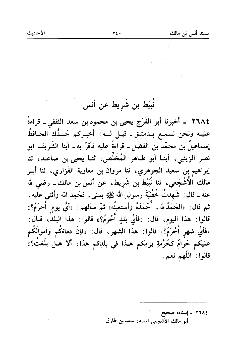 ٢٦٨٤ - أَخْبَرَنَا أَبُو الْفَرَجِ يَحْيَى بْنُ مَحْمُودِ بْنِ سَعْدٍ الثَّقَفِيُّ - قِرَاءَةً عَلَيْهِ وَنَحْنُ نَسْمَعُ بِدِمَشْقَ - قِيلَ لَهُ: أَخْبَرَكُمْ جَدُّكَ الْحَافِظُ إِسْمَاعِيلُ بْنُ مُحَمَّدِ بْنِ الْفَضْلِ - قِرَاءَةً عَلَيْهِ فَأَقَرَّ بِهِ - أَبْنَا الشَّرِيفُ أَبُو نَصْرٍ الزَّيْنَبِيُّ، أَبْنَا أَبُو طَاهِرٍ الْمُخَلِّصُ، ثَنَا يَحْيَى بْنُ صَاعِدٍ، ثَنَا إِبْرَاهِيمُ بْنُ سَعِيدٍ الْجَوْهَرِيُّ، ثَنَا مَرْوَانُ بْنُ مُعَاوِيَةَ الْفَزَارِيُّ، ثَنَا أَبُو مَالِكٍ الْأَشْجَعِيُّ، ثَنَا نُبَيْطُ بْنُ شَرِيطٍ، عَنْ أَنَسِ بْنِ مَالِكٍ رَضِيَ اللهُ عَنْهُ قَالَ: «شَهِدْتُ خُطْبَةَ رَسُولِ اللهِ صَلَّى اللهُ عَلَيْهِ وَسَلَّمَ بِمِنًى، فَحَمِدَ اللهَ وَأَثْنَى عَلَيْهِ ثُمَّ قَالَ: الْحَمْدُ لِلهِ أَحْمَدُهُ وَأَسْتَعِينُهُ، ثُمَّ سَأَلَهُمْ: أَيُّ يَوْمٍ أَحْرَمُ؟ قَالُوا: هَذَا الْيَوْمُ، قَالَ: فَأَيُّ بَلَدٍ أَحْرَمُ؟ قَالُوا: هَذَا الْبَلَدُ، قَالَ: فَأَيُّ شَهْرٍ أَحْرَمُ؟ قَالُوا: هَذَا الشَّهْرُ، قَالَ: فَإِنَّ دِمَاءَكُمْ وَأَمْوَالَكُمْ عَلَيْكُمْ حَرَامٌ كَحُرْمَةِ يَوْمِكُمْ هَذَا فِي بَلَدِكُمْ هَذَا، أَلَا هَلْ بَلَّغْتُ؟ قَالُوا: اللَّهُمَّ نَعَمْ».