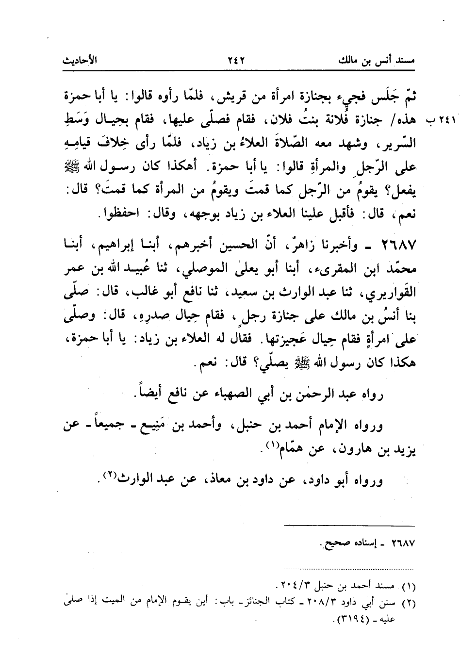 ٢٦٨٧ - وَأَخْبَرَنَا زَاهِرٌ، أَنَّ الْحُسَيْنَ أَخْبَرَهُمْ، أَبْنَا إِبْرَاهِيمُ، أَبْنَا مُحَمَّدٌ ابْنُ الْمُقْرِئِ، أَبْنَا أَبُو يَعْلَى الْمَوْصِلِيُّ، ثَنَا عُبَيْدُ اللهِ بْنُ عُمَرَ الْقَوَارِيرِيُّ، ثَنَا عَبْدُ الْوَارِثِ بْنُ سَعِيدٍ، ثَنَا نَافِعٌ أَبُو غَالِبٍ قَالَ: «صَلَّى بِنَا أَنَسُ بْنُ مَالِكٍ عَلَى جِنَازَةِ رَجُلٍ فَقَامَ حِيَالَ صَدْرِهِ، قَالَ: وَصَلَّى عَلَى امْرَأَةٍ فَقَامَ حِيَالَ عَجِيزَتِهَا، فَقَالَ لَهُ الْعَلَاءُ بْنُ زِيَادٍ: يَا أَبَا حَمْزَةَ، هَكَذَا كَانَ رَسُولُ اللهِ صَلَّى اللهُ عَلَيْهِ وَسَلَّمَ يُصَلِّي؟ قَالَ: نَعَمْ».