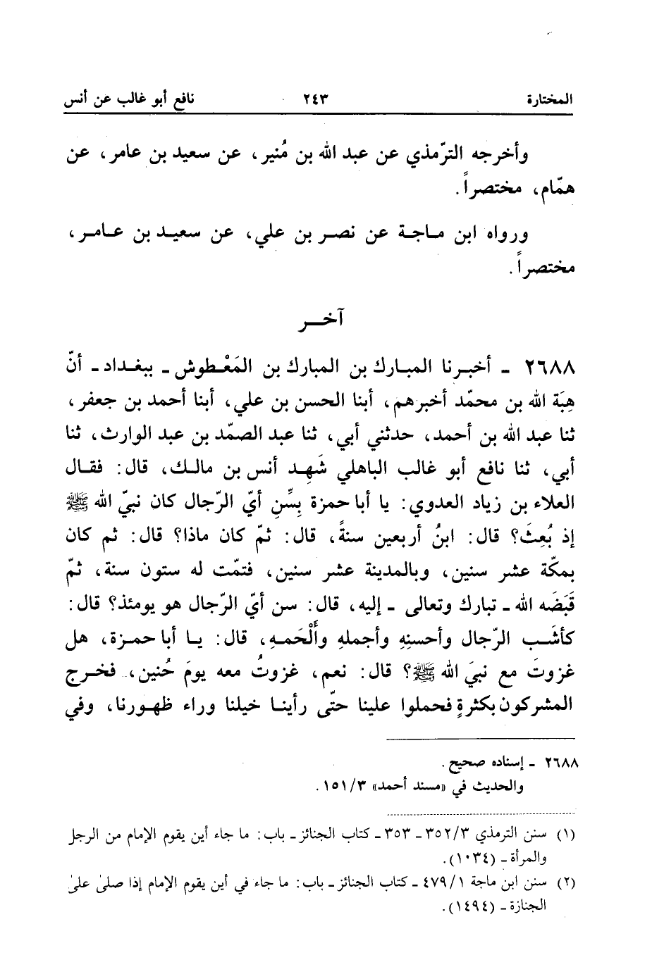 ٢٦٨٨ - أَخْبَرَنَا الْمُبَارَكُ بْنُ الْمُبَارَكِ بْنِ الْمَعْطُوشِ - بِبَغْدَادَ - أَنَّ هِبَةَ اللهِ بْنَ مُحَمَّدٍ أَخْبَرَهُمْ، أَبْنَا الْحَسَنُ بْنُ عَلِيٍّ، أَبْنَا أَحْمَدُ بْنُ جَعْفَرٍ، ثَنَا عَبْدُ اللهِ بْنُ أَحْمَدَ، حَدَّثَنِي أَبِي، ثَنَا عَبْدُ الصَّمَدِ بْنُ عَبْدِ الْوَارِثِ، ثَنَا أَبِي، ثَنَا نَافِعٌ أَبُو غَالِبٍ الْبَاهِلِيُّ شَهِدَ أَنَسَ بْنَ مَالِكٍ، قَالَ: «فَقَالَ الْعَلَاءُ بْنُ زِيَادٍ الْعَدَوِيُّ: يَا أَبَا حَمْزَةَ، بِسِنِّ أَيِّ الرِّجَالِ كَانَ نَبِيُّ اللهِ صَلَّى اللهُ عَلَيْهِ وَسَلَّمَ إِذْ بُعِثَ؟ قَالَ: ابْنُ أَرْبَعِينَ سَنَةً، قَالَ: ثُمَّ كَانَ مَاذَا؟ قَالَ: ثُمَّ كَانَ بِمَكَّةَ عَشْرَ سِنِينَ وَبِالْمَدِينَةِ عَشْرَ سِنِينَ فَتَمَّتْ لَهُ سِتُّونَ سَنَةً، ثُمَّ قَبَضَهُ اللهُ تَبَارَكَ وَتَعَالَى إِلَيْهِ، قَالَ: سِنُّ أَيِّ الرِّجَالِ هُوَ يَوْمَئِذٍ؟ قَالَ: كَأَشَبِّ الرِّجَالِ وَأَحْسَنِهِ وَأَجْمَلِهِ وَأَلْحَمِهِ، قَالَ: يَا أَبَا حَمْزَةَ، هَلْ غَزَوْتَ مَعَ نَبِيِّ اللهِ صَلَّى اللهُ عَلَيْهِ وَسَلَّمَ؟ قَالَ: نَعَمْ، غَزَوْتُ مَعَهُ يَوْمَ حُنَيْنٍ، فَخَرَجَ الْمُشْرِكُونَ بِكَثْرَةٍ فَحَمَلُوا عَلَيْنَا حَتَّى رَأَيْنَا خَيْلَنَا وَرَاءَ ظُهُورِنَا، وَفِي