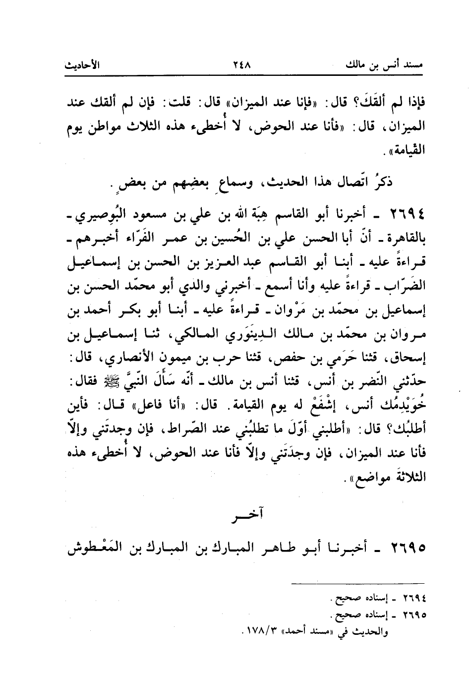 ٢٦٩٤ - أَخْبَرَنَا أَبُو الْقَاسِمِ هِبَةُ اللهِ بْنُ عَلِيِّ بْنِ مَسْعُودٍ الْبُوصِيرِيُّ - بِالْقَاهِرَةِ - أَنَّ أَبَا الْحَسَنِ عَلِيَّ بْنَ الْحُسَيْنِ بْنِ عُمَرَ الْفَرَّاءَ أَخْبَرَهُمْ - قِرَاءَةً عَلَيْهِ - أَبْنَا أَبُو الْقَاسِمِ عَبْدُ الْعَزِيزِ بْنُ الْحَسَنِ بْنِ إِسْمَاعِيلَ الضَّرَّابُ - قِرَاءَةً عَلَيْهِ وَأَنَا أَسْمَعُ - أَخْبَرَنِي وَالِدِي أَبُو مُحَمَّدٍ الْحَسَنُ بْنُ إِسْمَاعِيلَ بْنِ مُحَمَّدِ بْنِ مَرْوَانَ - قِرَاءَةً عَلَيْهِ - أَبْنَا أَبُو بَكْرٍ أَحْمَدُ بْنُ مَرْوَانَ بْنِ مُحَمَّدِ بْنِ مَالِكٍ الدِّينَوَرِيُّ الْمَالِكِيُّ، ثَنَا إِسْمَاعِيلُ بْنُ إِسْحَاقَ، قَثَنَا حَرَمِيُّ بْنُ حَفْصٍ، قَثَنَا حَرْبُ بْنُ مَيْمُونٍ الْأَنْصَارِيُّ، قَالَ: حَدَّثَنِي النَّضْرُ بْنُ أَنَسٍ، قَثَنَا أَنَسُ بْنُ مَالِكٍ، «أَنَّهُ سَأَلَ النَّبِيَّ صَلَّى اللهُ عَلَيْهِ وَسَلَّمَ فَقَالَ: خُوَيْدِمُكَ أَنَسٌ اشْفَعْ لَهُ يَوْمَ الْقِيَامَةِ، قَالَ: أَنَا فَاعِلٌ، قَالَ: فَأَيْنَ أَطْلُبُكَ؟ قَالَ: اطْلُبْنِي أَوَّلَ مَا تَطْلُبُنِي عِنْدَ الصِّرَاطِ، فَإِنْ وَجَدْتَنِي وَإِلَّا فَأَنَا عِنْدَ الْمِيزَانِ، فَإِنْ وَجَدْتَنِي وَإِلَّا فَأَنَا عِنْدَ الْحَوْضِ، لَا أُخْطِئُ هَذِهِ الثَّلَاثَةَ مَوَاضِعَ».