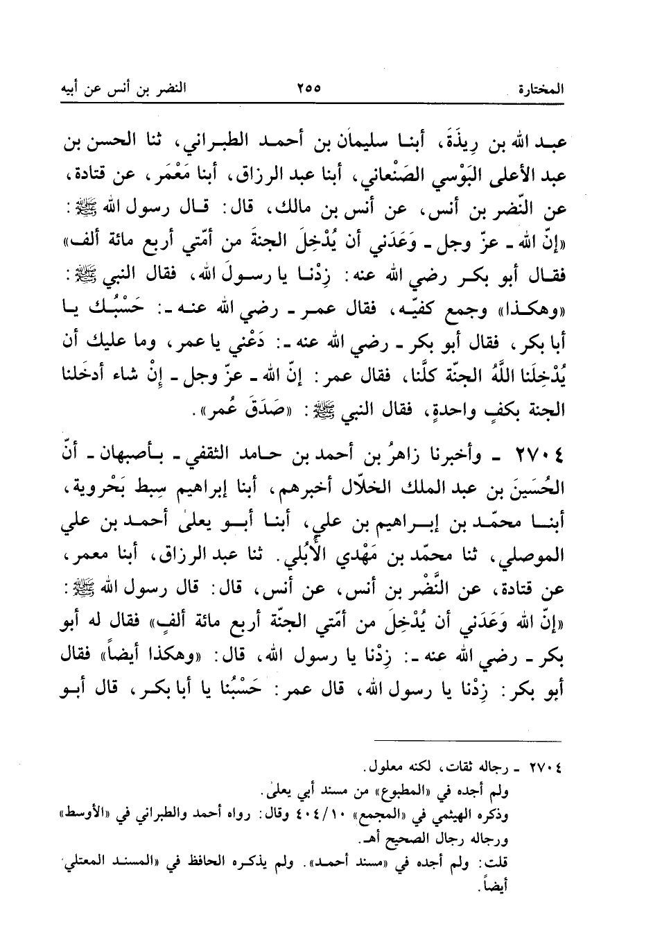 ٢٧٠٤ - وَأَخْبَرَنَا زَاهِرُ بْنُ أَحْمَدَ بْنِ حَامِدٍ الثَّقَفِيُّ - بِأَصْبَهَانَ - أَنَّ الْحُسَيْنَ بْنَ عَبْدِ الْمَلِكِ الْخَلَّالَ أَخْبَرَهُمْ، أَبْنَا إِبْرَاهِيمُ سِبْطُ بَحْرَوَيْهِ، أَبْنَا مُحَمَّدُ بْنُ إِبْرَاهِيمَ بْنِ عَلِيٍّ، أَبْنَا أَبُو يَعْلَى أَحْمَدُ بْنُ عَلِيٍّ الْمَوْصِلِيُّ، ثَنَا مُحَمَّدُ بْنُ مَهْدِيٍّ الْأُبُلِّيُّ، ثَنَا عَبْدُ الرَّزَّاقِ، أَبْنَا مَعْمَرٌ، عَنْ قَتَادَةَ، عَنِ النَّضْرِ بْنِ أَنَسٍ، عَنْ أَنَسٍ، قَالَ: قَالَ رَسُولُ اللهِ صَلَّى اللهُ عَلَيْهِ وَسَلَّمَ: «إِنَّ اللهَ وَعَدَنِي أَنْ يُدْخِلَ مِنْ أُمَّتِي الْجَنَّةَ أَرْبَعَمِائَةِ أَلْفٍ، فَقَالَ لَهُ أَبُو بَكْرٍ رَضِيَ اللهُ عَنْهُ: زِدْنَا يَا رَسُولَ اللهِ، قَالَ: وَهَكَذَا أَيْضًا، فَقَالَ أَبُو بَكْرٍ: زِدْنَا يَا رَسُولَ اللهِ، قَالَ عُمَرُ: حَسْبُنَا يَا أَبَا بَكْرٍ، قَالَ أَبُو