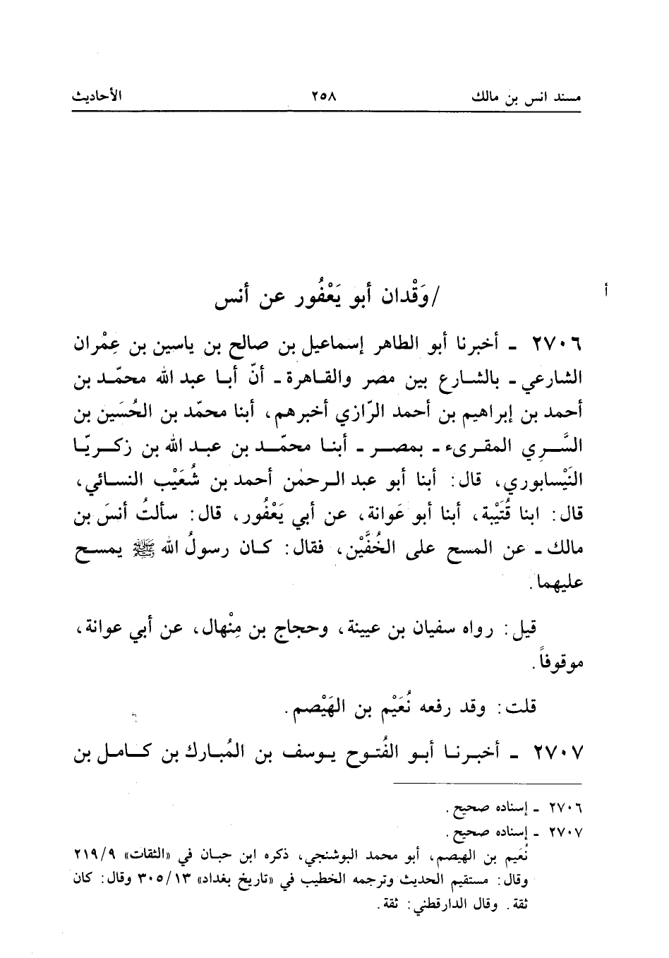 الْحُسَيْنِ بْنِ عَبْدِ اللهِ بْنِ مُحَمَّدٍ الْخَفَّافُ - بِبَغْدَادَ - أَنَّ أَبَا مَنْصُورٍ عَبْدَ الرَّحْمَنِ بْنَ مُحَمَّدٍ الْقَزَّازَ أَخْبَرَهُمْ، أَبْنَا أَبُو الْحُسَيْنِ أَحْمَدُ بْنُ مُحَمَّدِ بْنِ النَّقُورِ الْبَزَّارُ، أَبْنَا أَبُو الْقَاسِمِ عِيسَى بْنُ عَلِيِّ بْنِ عِيسَى، ثَنَا عَبْدُ اللهِ بْنُ مُحَمَّدٍ الْبَغَوِيُّ، ثَنَا أَبُو مُحَمَّدٍ نُعَيْمُ بْنُ الْهَيْصَمِ الْهَرَوِيُّ إِمْلَاءً مِنْ كِتَابِهِ، ثَنَا أَبُو عَوَانَةَ، عَنْ أَبِي يَعْفُورٍ قَالَ: «سَأَلْتُ أَنَسَ بْنَ مَالِكٍ عَنِ الْمَسْحِ عَلَى الْخُفَّيْنِ فَقَالَ: كَانَ رَسُولُ اللهِ صَلَّى اللهُ عَلَيْهِ وَسَلَّمَ يَمْسَحُ عَلَيْهِمَا».