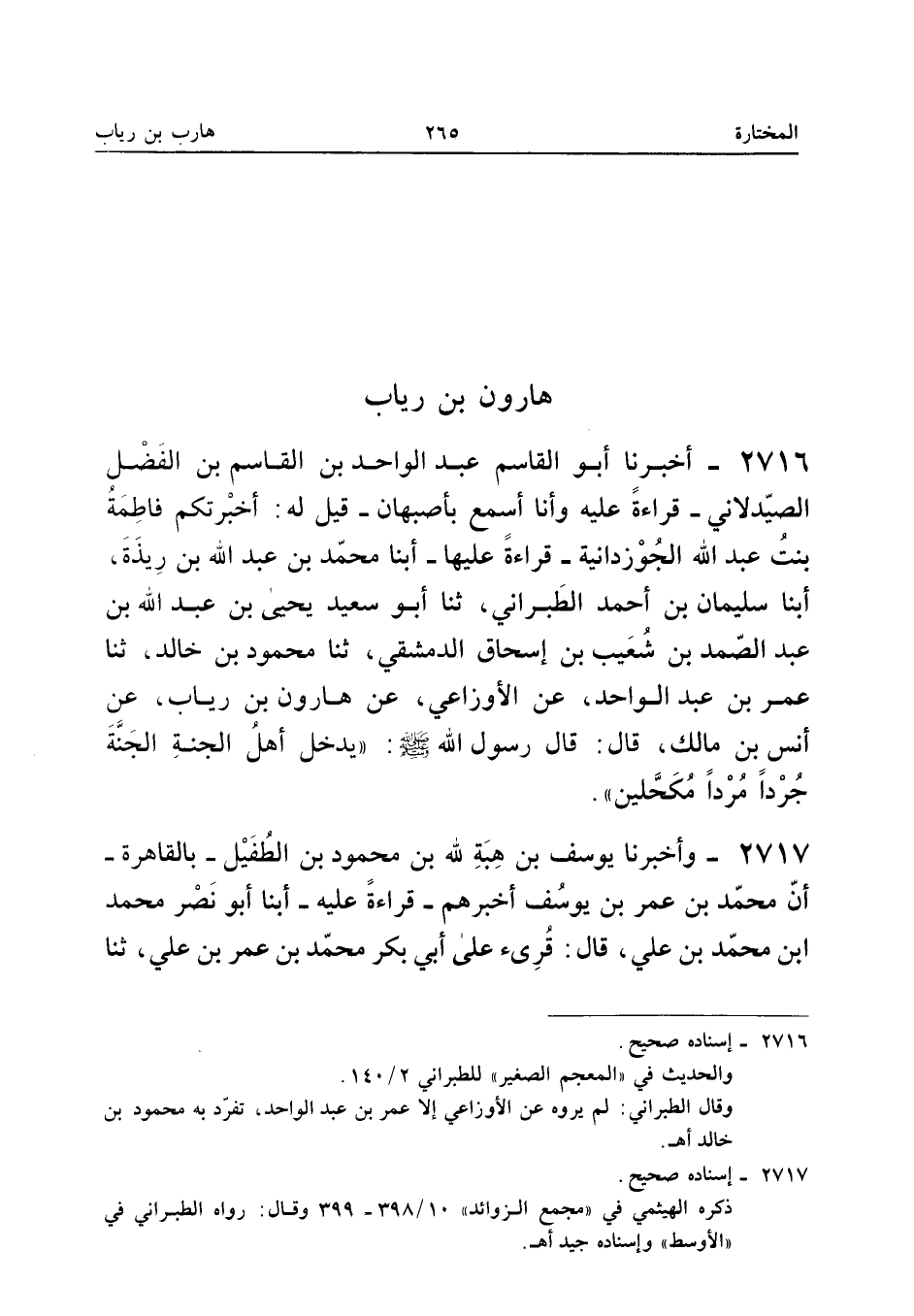 ٢٧١٦ - أَخْبَرَنَا أَبُو الْقَاسِمِ عَبْدُ الْوَاحِدِ بْنُ الْقَاسِمِ بْنِ الْفَضْلِ الصَّيْدَلَانِيُّ - قِرَاءَةً عَلَيْهِ وَأَنَا أَسْمَعُ بِأَصْبَهَانَ - قِيلَ لَهُ: أَخْبَرَتْكُمْ فَاطِمَةُ بِنْتُ عَبْدِ اللهِ الْجُوزْدَانِيَّةُ قِرَاءَةً عَلَيْهَا، أَبْنَا مُحَمَّدُ بْنُ عَبْدِ اللهِ بْنِ رِيذَةَ، أَبْنَا سُلَيْمَانُ بْنُ أَحْمَدَ الطَّبَرَانِيُّ، ثَنَا أَبُو سَعِيدٍ يَحْيَى بْنُ عَبْدِ اللهِ بْنِ عَبْدِ الصَّمَدِ بْنِ شُعَيْبِ بْنِ إِسْحَاقَ الدِّمَشْقِيُّ، ثَنَا مَحْمُودُ بْنُ خَالِدٍ، ثَنَا عُمَرُ بْنُ عَبْدِ الْوَاحِدِ، عَنِ الْأَوْزَاعِيِّ، عَنْ هَارُونَ بْنِ رِيَابٍ، عَنْ أَنَسِ بْنِ مَالِكٍ، قَالَ: قَالَ رَسُولُ اللهِ صَلَّى اللهُ عَلَيْهِ وَسَلَّمَ: «يَدْخُلُ أَهْلُ الْجَنَّةِ الْجَنَّةَ جُرْدًا مُرْدًا مُكَحَّلِينَ».