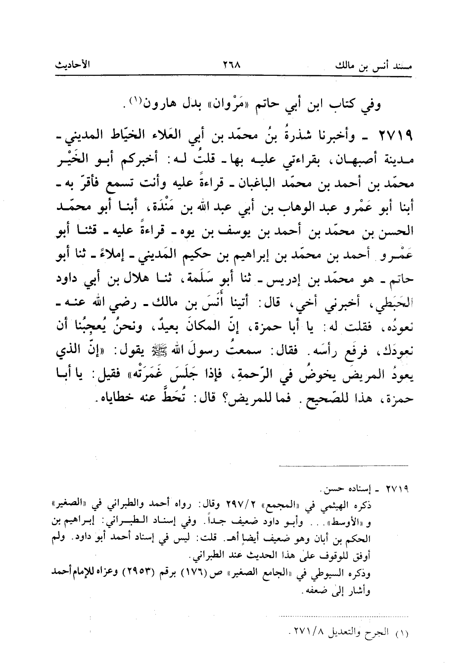 ٢٧١٩ - وَأَخْبَرَنَا شَذْرَةُ بْنُ مُحَمَّدِ بْنِ أَبِي الْعَلَاءِ الْخَيَّاطُ الْمَدِينِيُّ - مَدِينَةَ أَصْبَهَانَ، بِقِرَاءَتِي عَلَيْهِ بِهَا - قُلْتُ لَهُ: أَخْبَرَكُمْ أَبُو الْخَيْرِ مُحَمَّدُ بْنُ أَحْمَدَ بْنِ مُحَمَّدٍ الْبَاغْبَانُ - قِرَاءَةً عَلَيْهِ وَأَنْتَ تَسْمَعُ فَأَقَرَّ بِهِ - أَبْنَا أَبُو عَمْرٍو عَبْدُ الْوَهَّابِ بْنُ أَبِي عَبْدِ اللهِ بْنِ مَنْدَهْ، أَبْنَا أَبُو مُحَمَّدٍ الْحَسَنُ بْنُ مُحَمَّدِ بْنِ أَحْمَدَ بْنِ يُوسُفَ بْنِ يَوَهْ - قِرَاءَةً عَلَيْهِ - قَثَنَا أَبُو عَمْرٍو أَحْمَدُ بْنُ مُحَمَّدِ بْنِ إِبْرَاهِيمَ بْنِ حَكِيمٍ الْمَدِينِيُّ إِمْلَاءً، ثَنَا أَبُو حَاتِمٍ هُوَ مُحَمَّدُ بْنُ إِدْرِيسَ، ثَنَا أَبُو سَلَمَةَ، ثَنَا هِلَالُ بْنُ أَبِي دَاوُدَ الْحَبَطِيُّ، أَخْبَرَنِي أَخِي، قَالَ: «أَتَيْنَا أَنَسَ بْنَ مَالِكٍ رَضِيَ اللهُ عَنْهُ نَعُودُهُ فَقُلْتُ لَهُ: يَا أَبَا حَمْزَةَ، إِنَّ الْمَكَانَ بَعِيدٌ، وَنَحْنُ يُعْجِبُنَا أَنْ نَعُودَكَ، فَرَفَعَ رَأْسَهُ فَقَالَ: سَمِعْتُ رَسُولَ اللهِ صَلَّى اللهُ عَلَيْهِ وَسَلَّمَ يَقُولُ: إِنَّ الَّذِي يَعُودُ الْمَرِيضَ يَخُوضُ فِي الرَّحْمَةِ، فَإِذَا جَلَسَ غَمَرَتْهُ، فَقِيلَ: يَا أَبَا حَمْزَةَ، هَذَا لِلصَّحِيحِ، فَمَا لِلْمَرِيضِ؟ قَالَ: تُحَطُّ عَنْهُ خَطَايَاهُ».